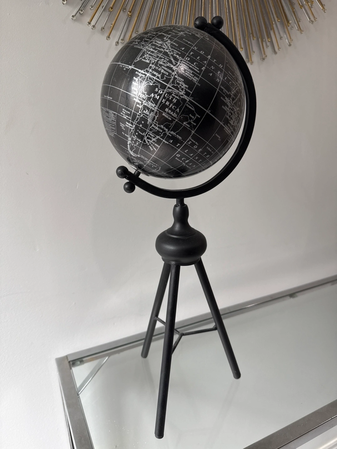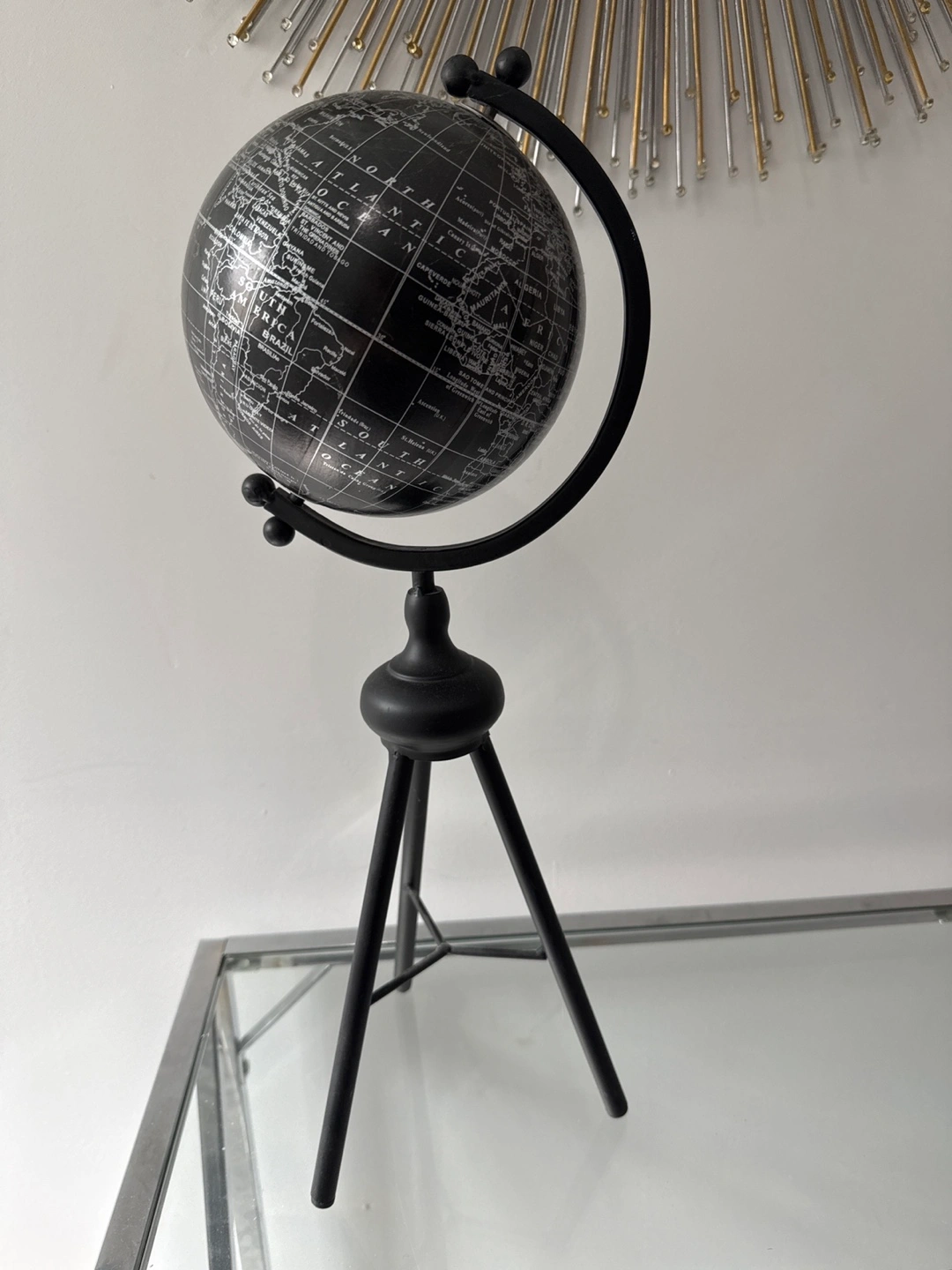 Here's a stylish black decorative globe on a stand! It's in great condition and would look lovely in any room. It adds a touch of sophistication and is perfect for adding some character to your space