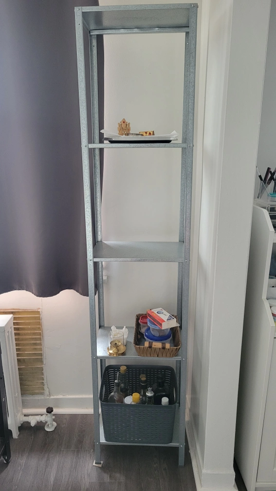 Selling a gently used IKEA HYLLIS shelving unit. It's in great shape and perfect for adding some vertical storage to any room. The dimensions are 27 cm (10 5/8 ") wide, 40 cm (15 3/4") deep, and 183 cm (72") tall. It's lightweight and easy to move around. I cannot dismantle it but you are welcome to do it.