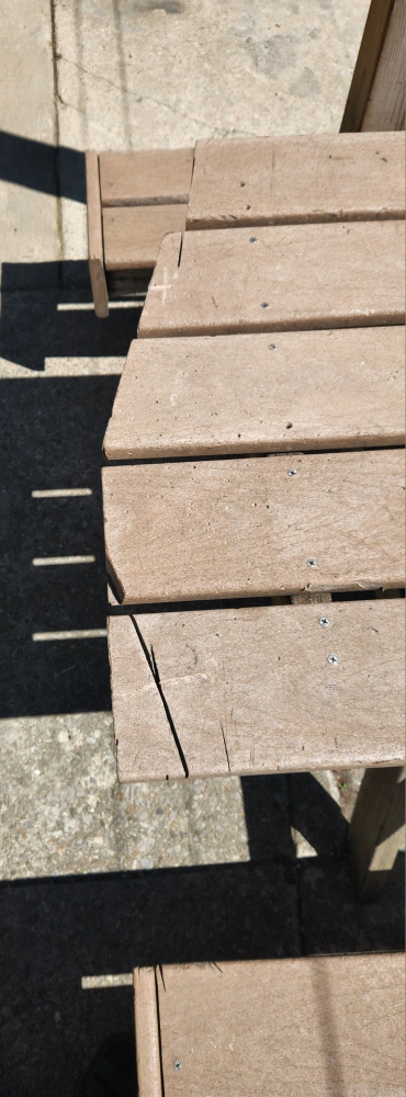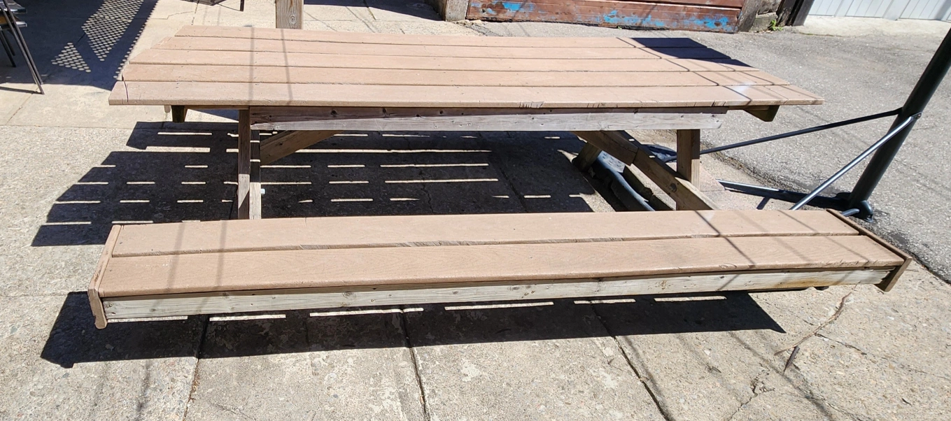 Selling a used picnic table made with composite deck and wood....It has some wear and tear, but is otherwise in good condition and ready for use. Perfect for enjoying the outdoors! it's very heavy and will require a truck to take it away.