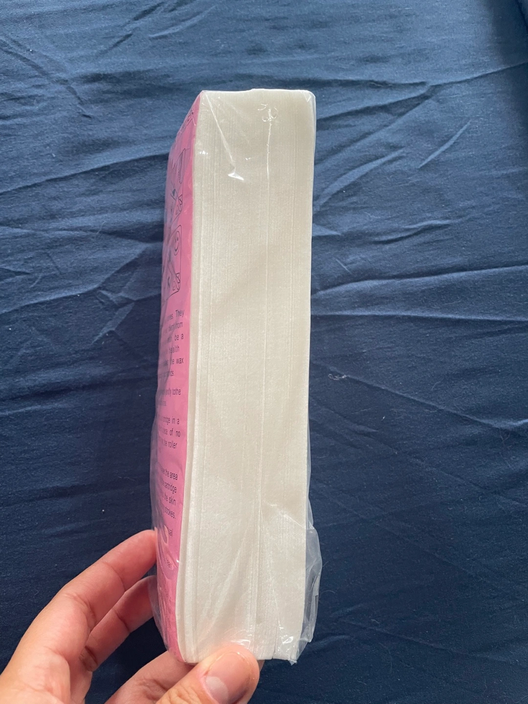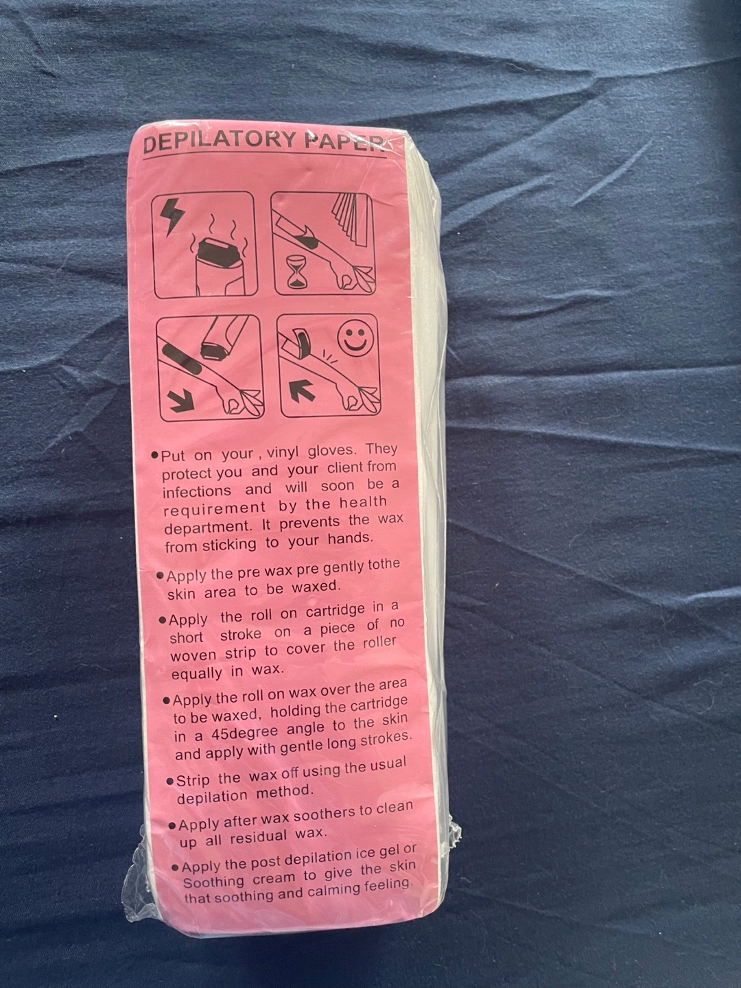 Selling a pack of depilatory paper wax strips. These are great for use with roll-on wax applicators. Instructions are printed on the packaging, including how to prep the skin, apply the wax, and remove the strips. Perfect for a smooth waxing experience at home