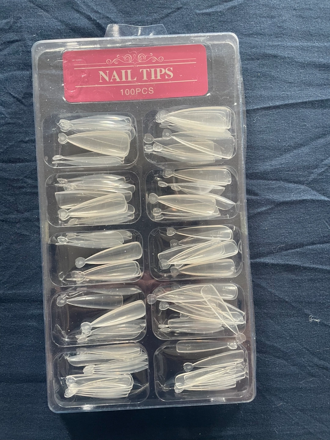 Selling a set of 100 nail tips. Perfect for creating your own unique nail designs at home! The tips are clear and come in a plastic case.