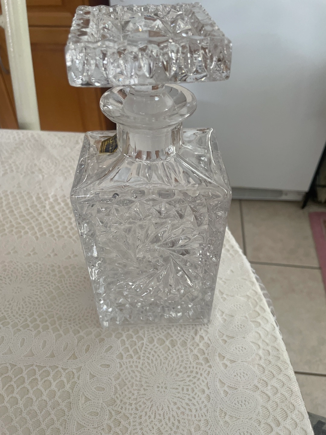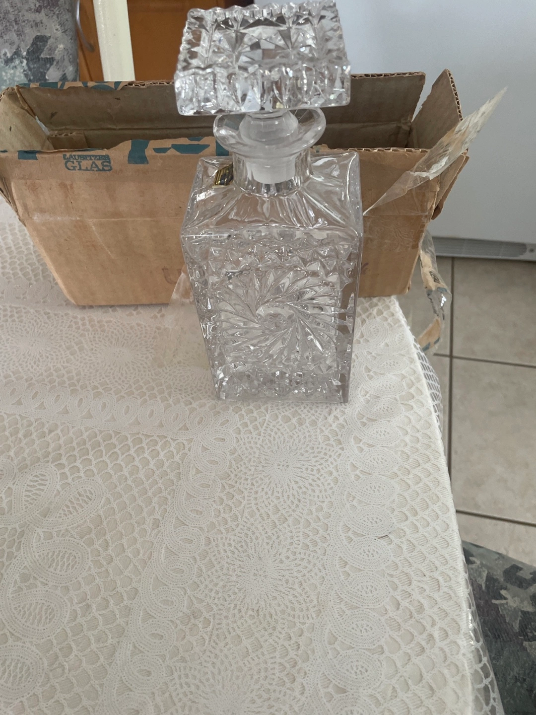 Selling a beautiful lead crystal decanter. It's in great condition and comes with the original box. The label indicates it's made of 24% lead oxide and was made in the German Democratic Republic. It would make a lovely addition to any home bar or collection! Brand new in box.