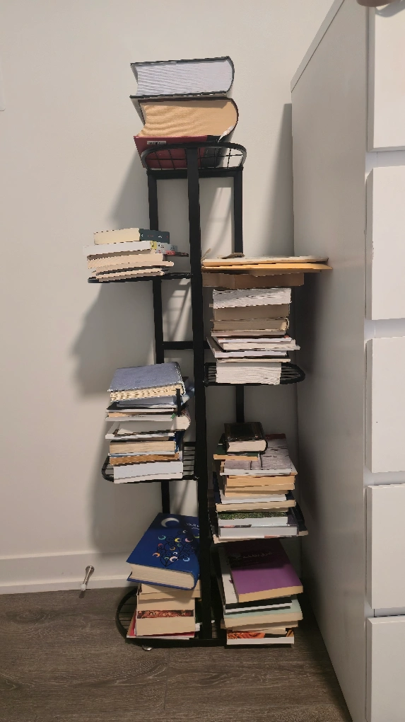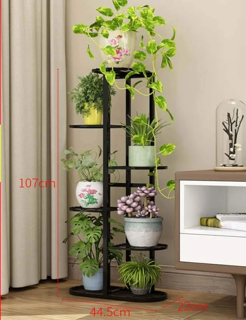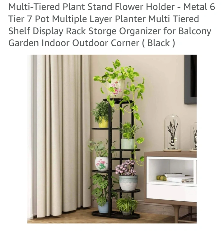 Selling a multi-tiered metal plant stand! It's perfect for displaying plants or other items in your balcony, garden, or indoors. The stand is black and has multiple tiers for holding several pots or items. It also can be used as a shelf display rack or storage organizer