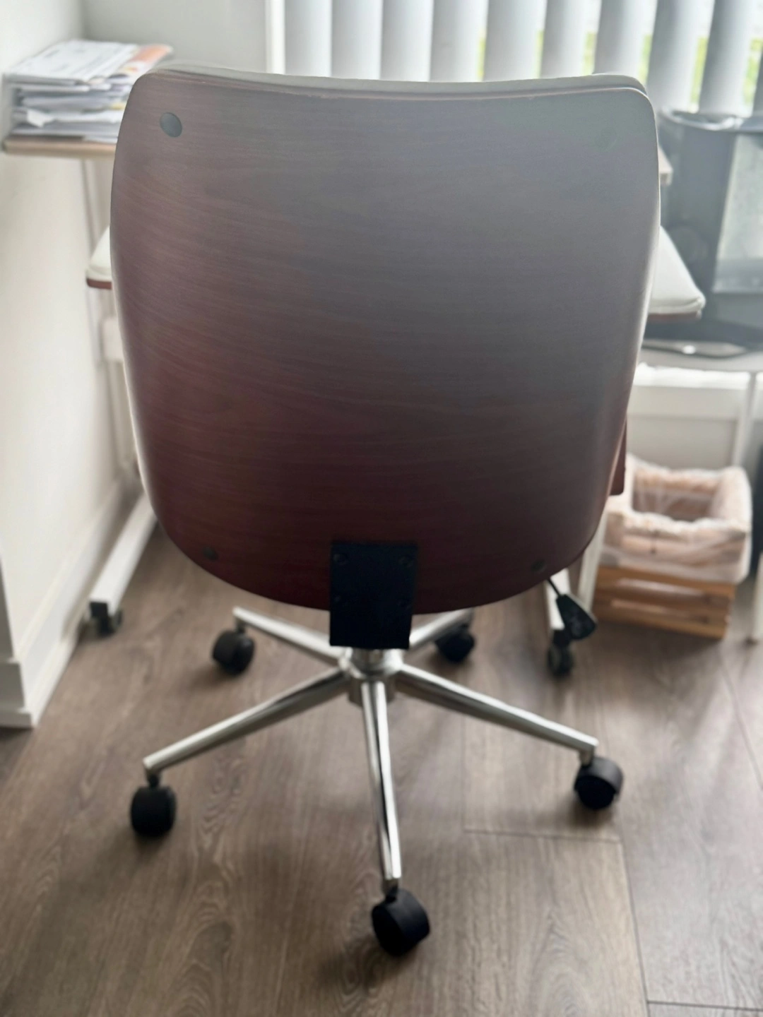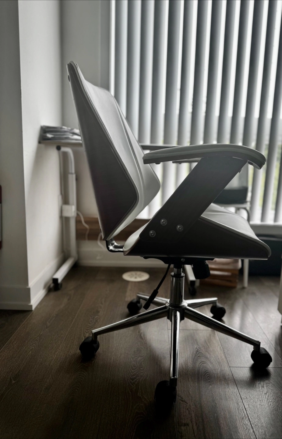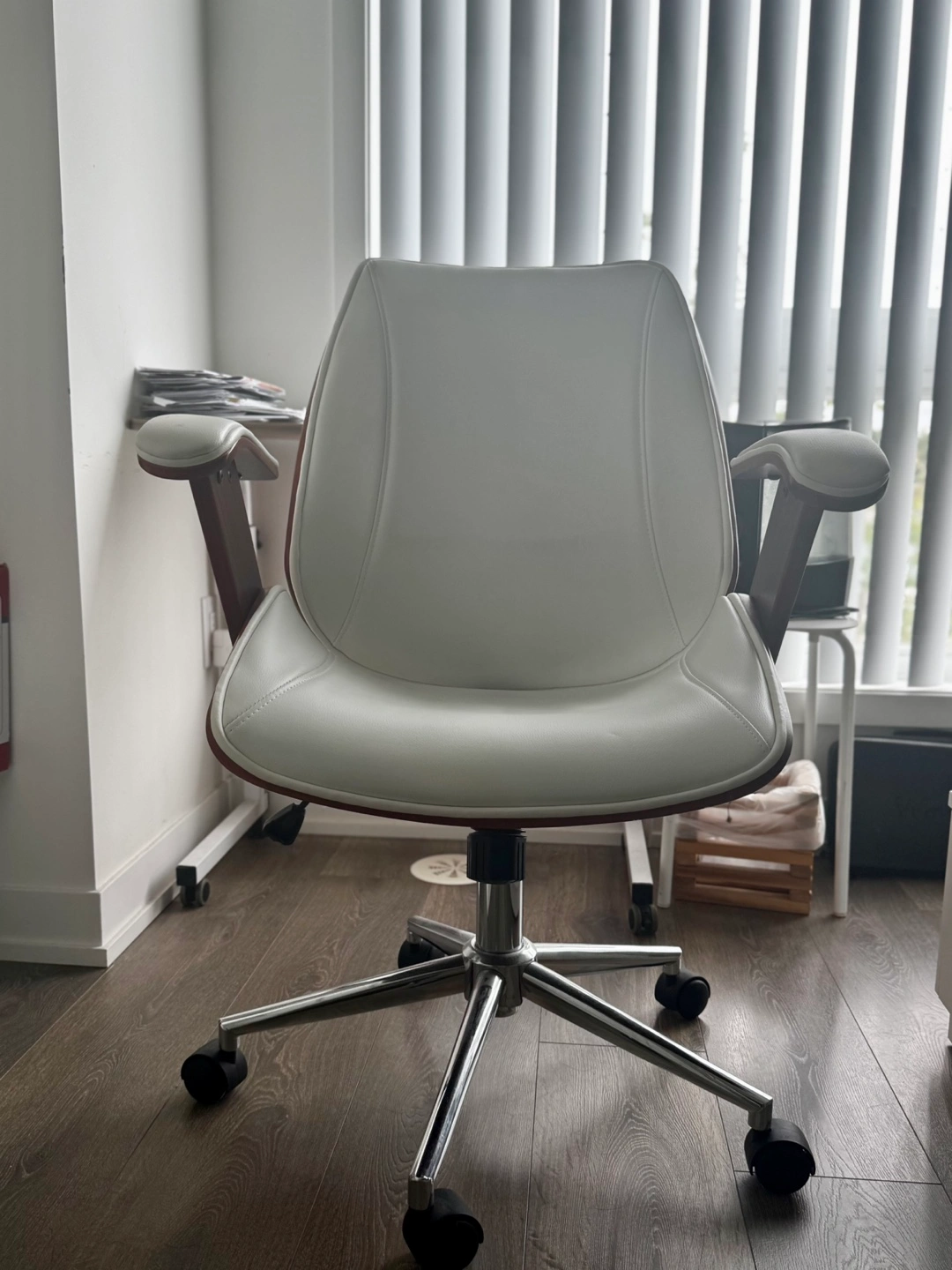 Here's a stylish office chair with a white leather seat and back, complemented by wood trim on the armrests and back. It has a sturdy chrome base with wheels, making it easy to move around your workspace. It's in great shape and ready to add some comfort and style to your home office