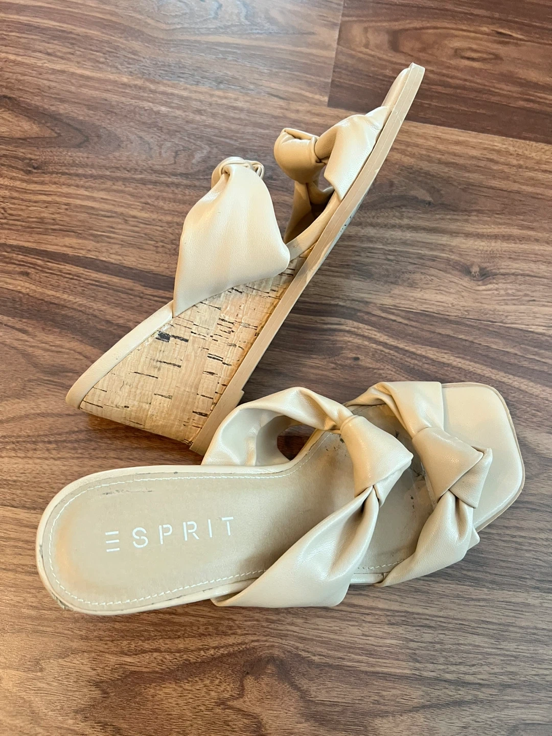 Cute pair of Esprit wedge sandals in a neutral beige colour. These are in good condition and feature a stylish knot detail on the front. Perfect for adding a little height and style to your summer outfits They are super comfortable and good for parties that require long durations on your feet Esprit Beige Wedge Sandals