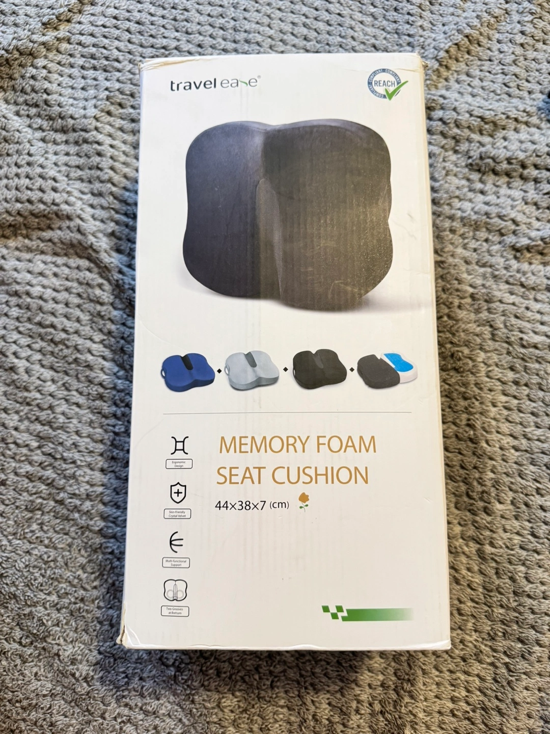 I'm selling a brand new Travel Ease seat cushion, still in its original box! This cushion is designed for pressure relief and features a 3D mesh cover, high-tech gel pad, and slow rebound memory foam. It also has a non-slip bottom. It measures 38 cm x 44 cm x 7 cm.