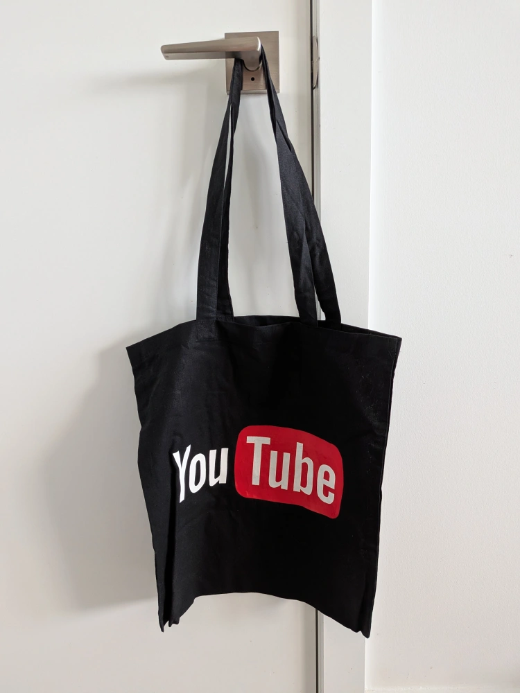 Selling a black tote bag with the YouTube logo on it. It's brand new and perfect for carrying groceries or books!
