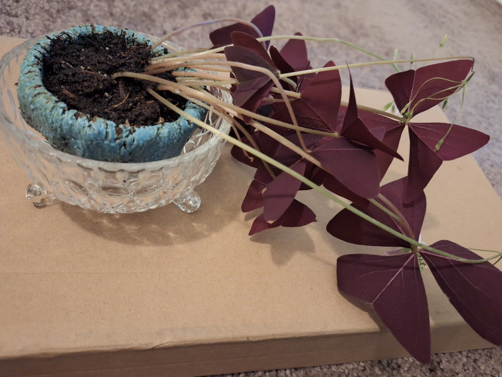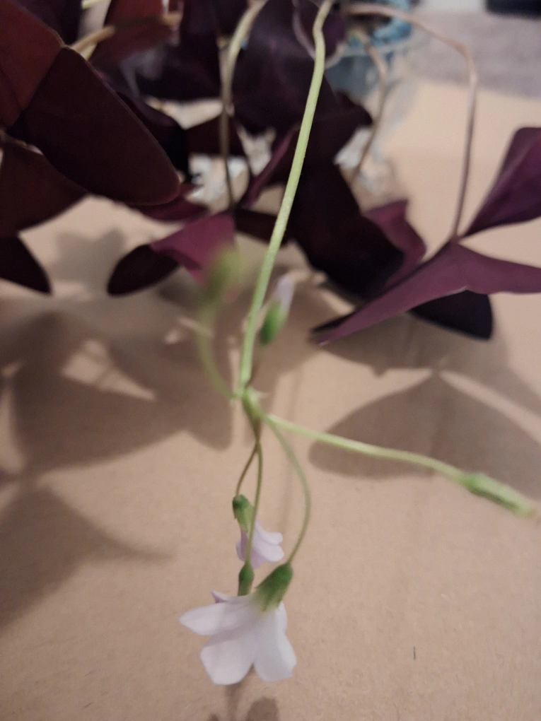 Selling an Oxalis Triangularis plant. It has beautiful deep purple leaves and delicate white flowers. Perfect for adding a touch of nature to your home or office!