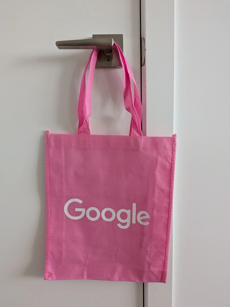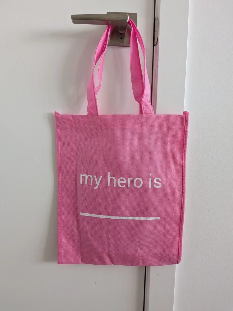 A reusable pink tote bag from Google! One side says "Google" and the other says "my hero is"