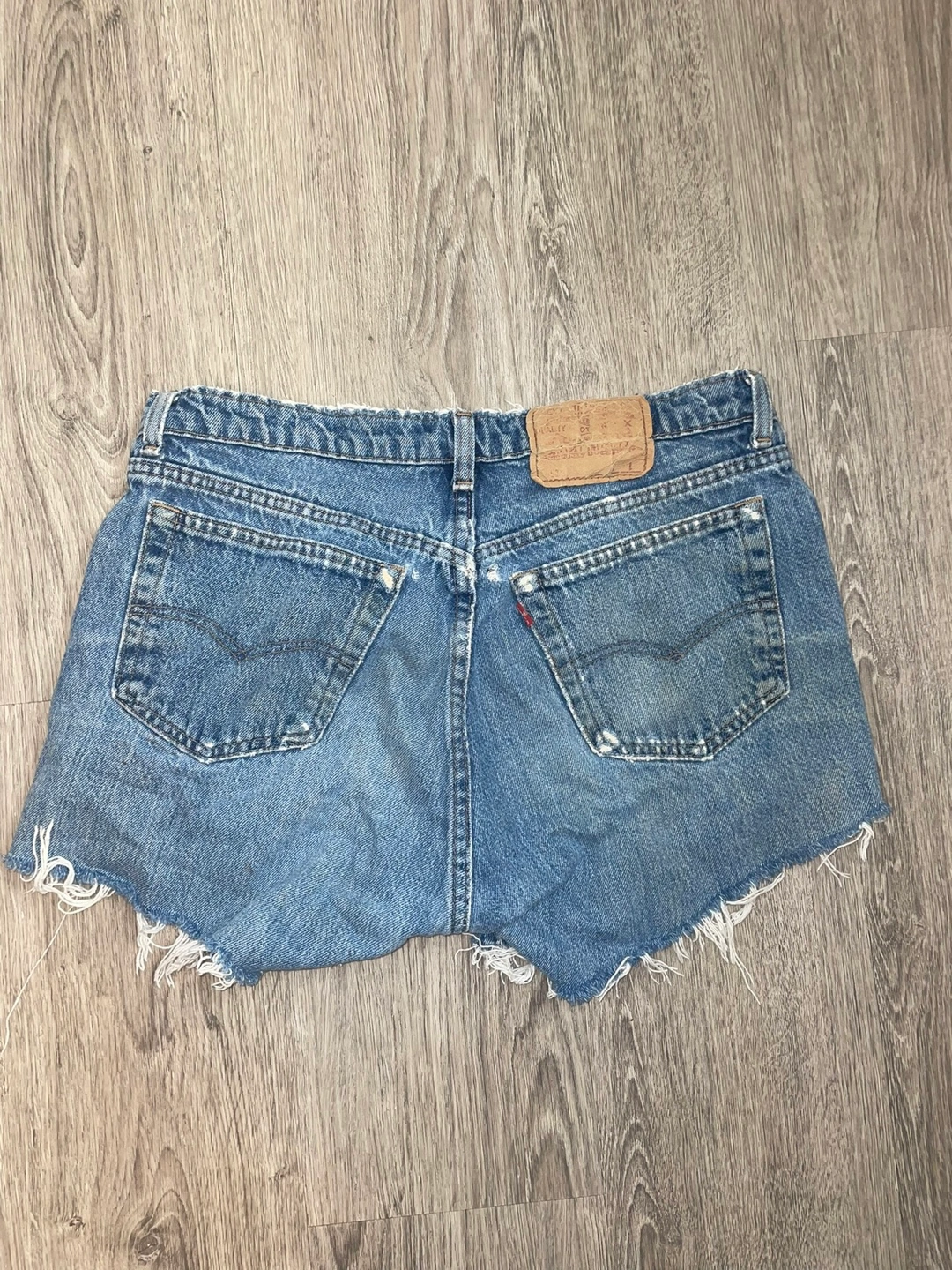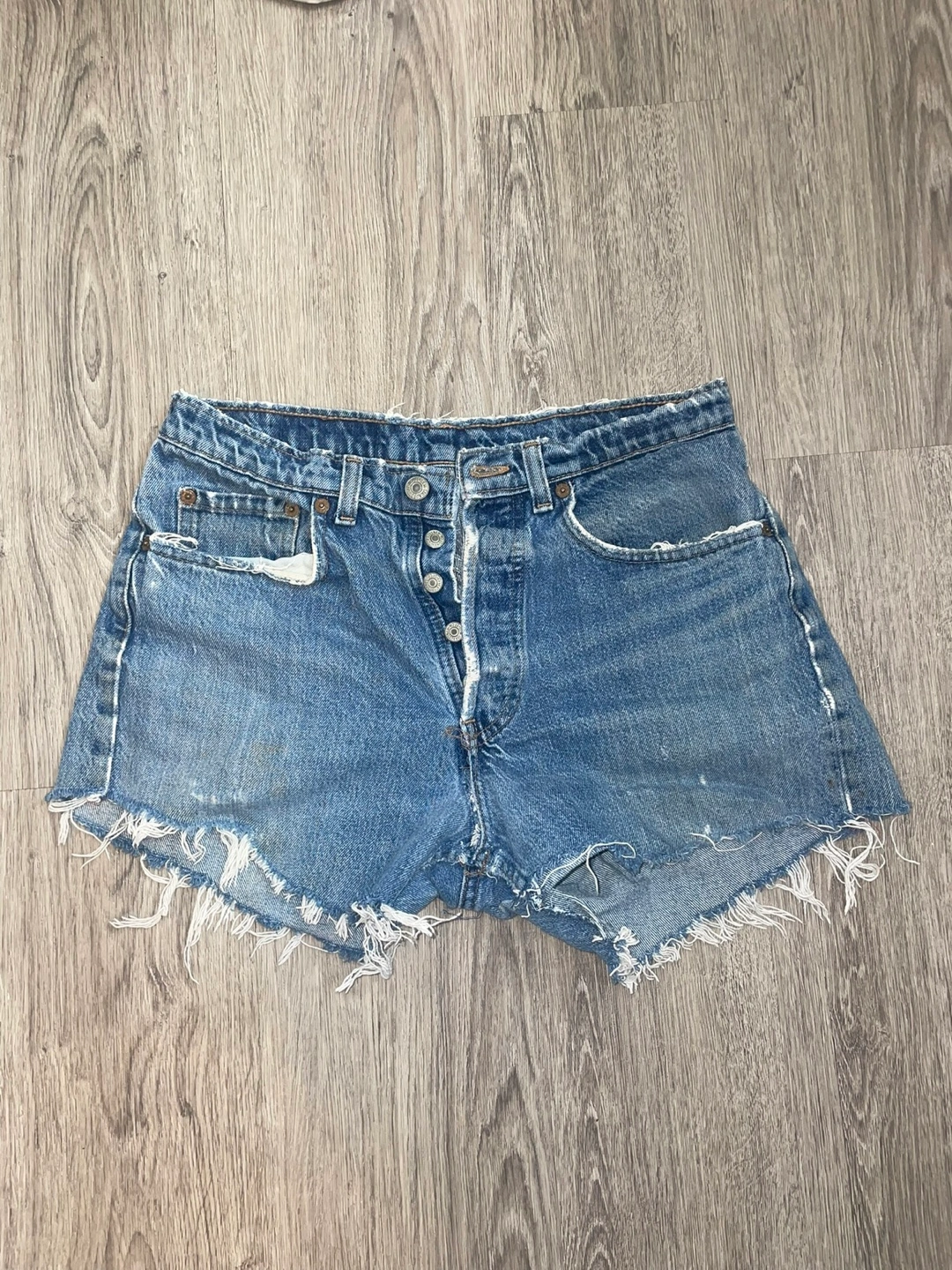 Levi's denim cut-off shorts in a light wash. These shorts have a classic five-pocket design and a button fly. Perfect for a casual, summery look!