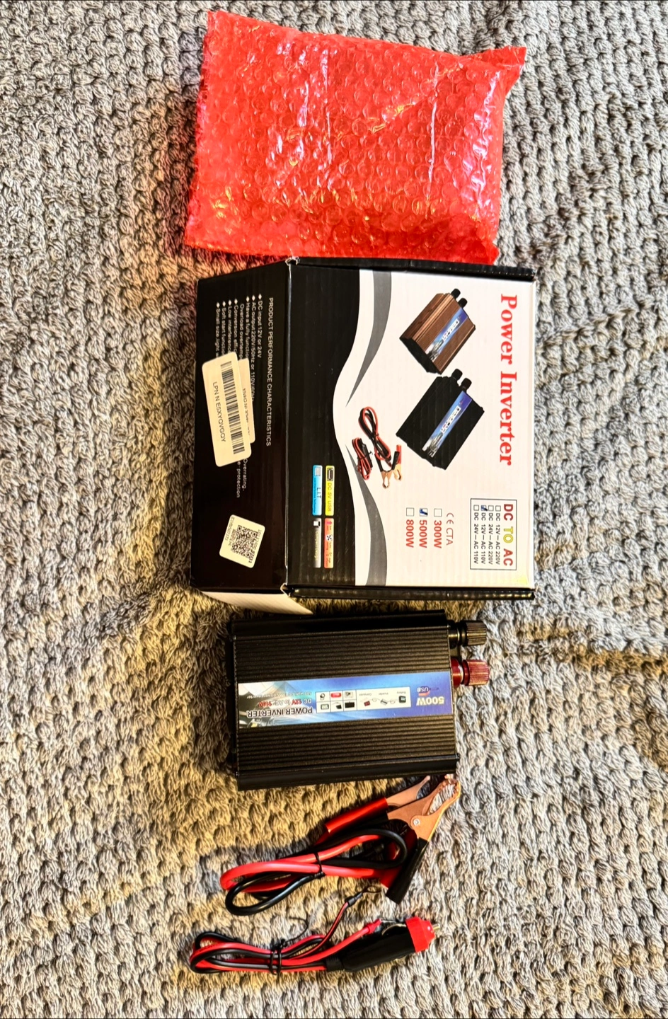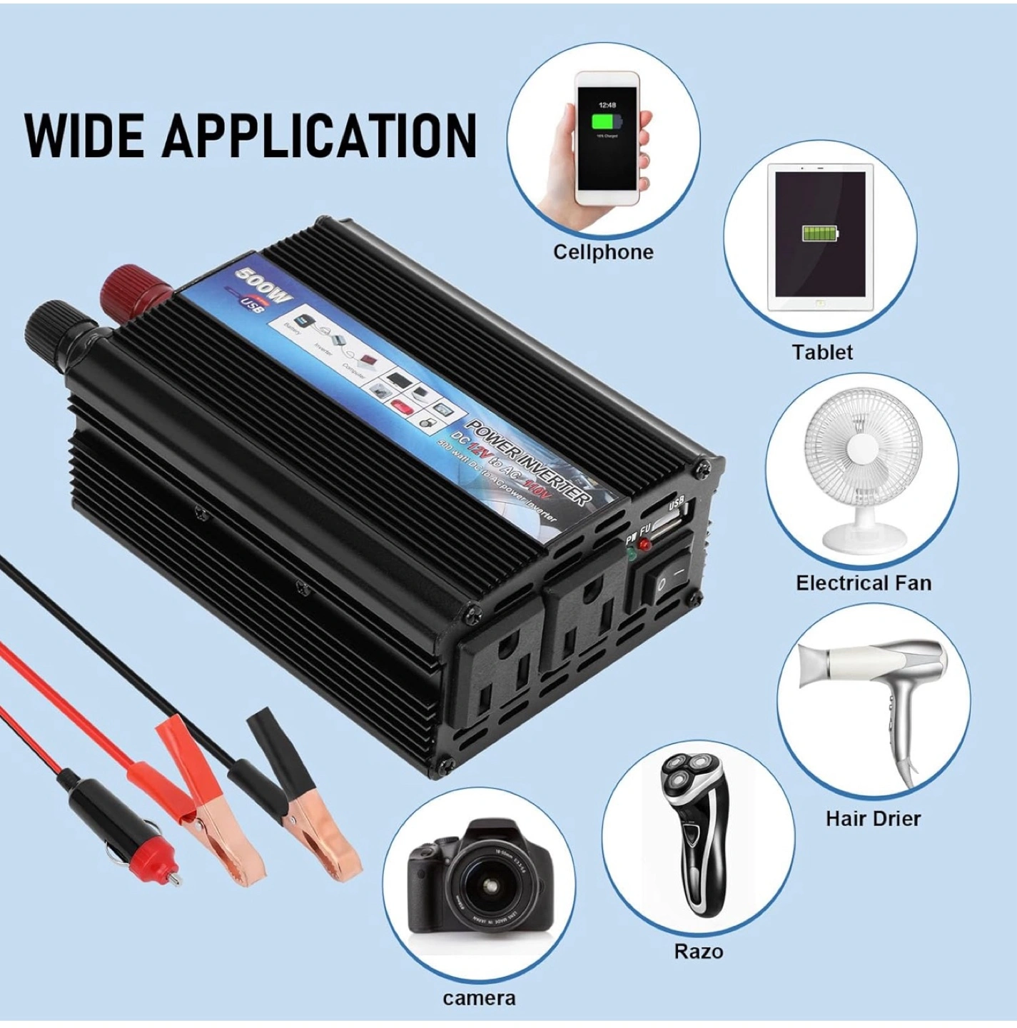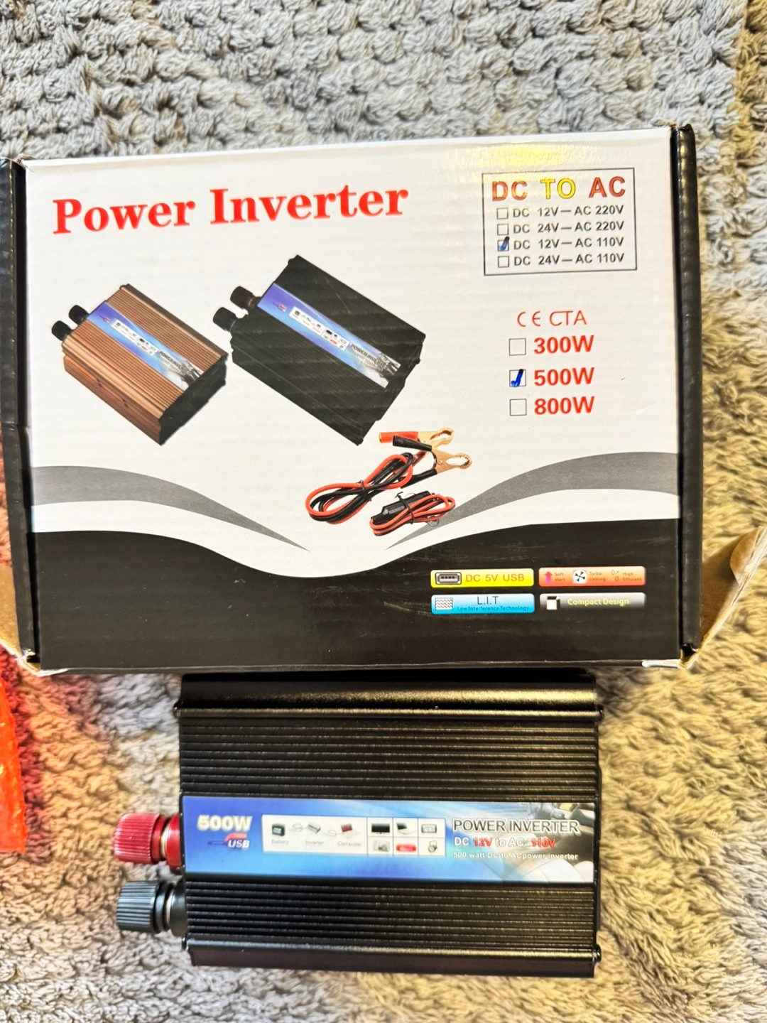 I'm selling a 500W Power Inverter, perfect for converting DC 12V to AC 110V. It's great for powering electronics, digital products, and charging outdoor appliances. Key features include: - DC 12V or 24V input, AC 110V/60Hz output - Fully functional protective circuit with over-voltage, overload, and inverse-protection - Conversion efficiency up to 90% - Smart cooling fan technology - Soft start function - Small size, light weight, and noise-free maintenance It comes with the box and all included components. It's a handy device for emergency jobs and household appliances