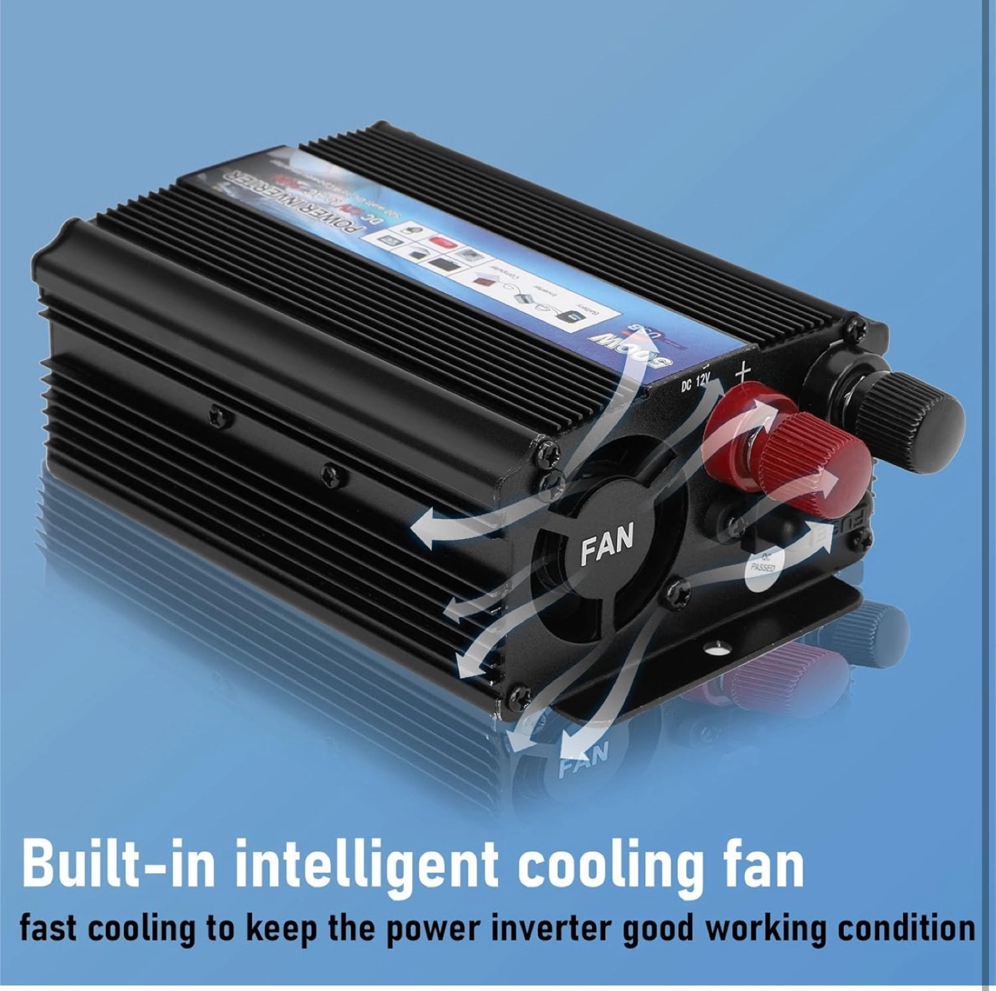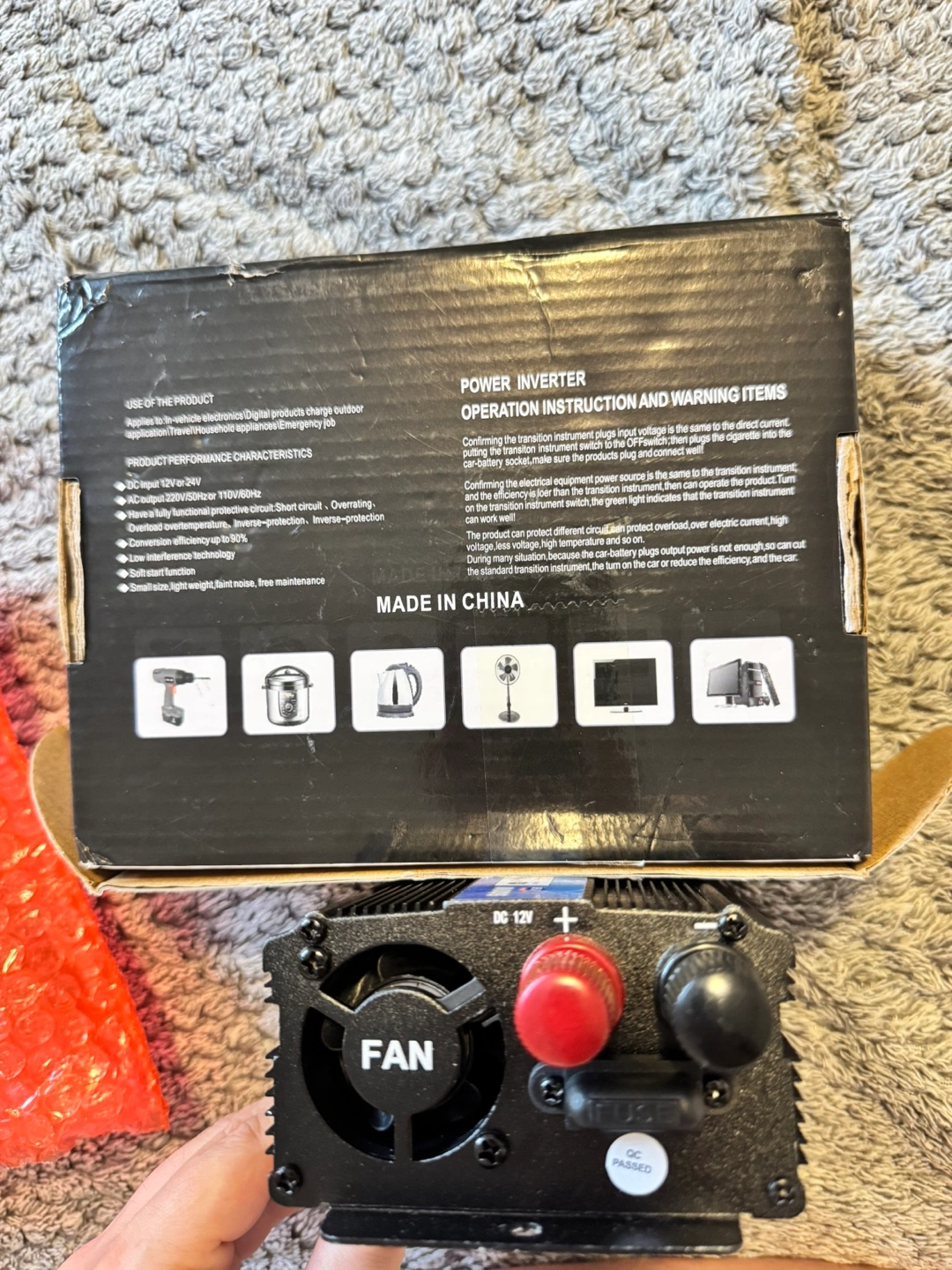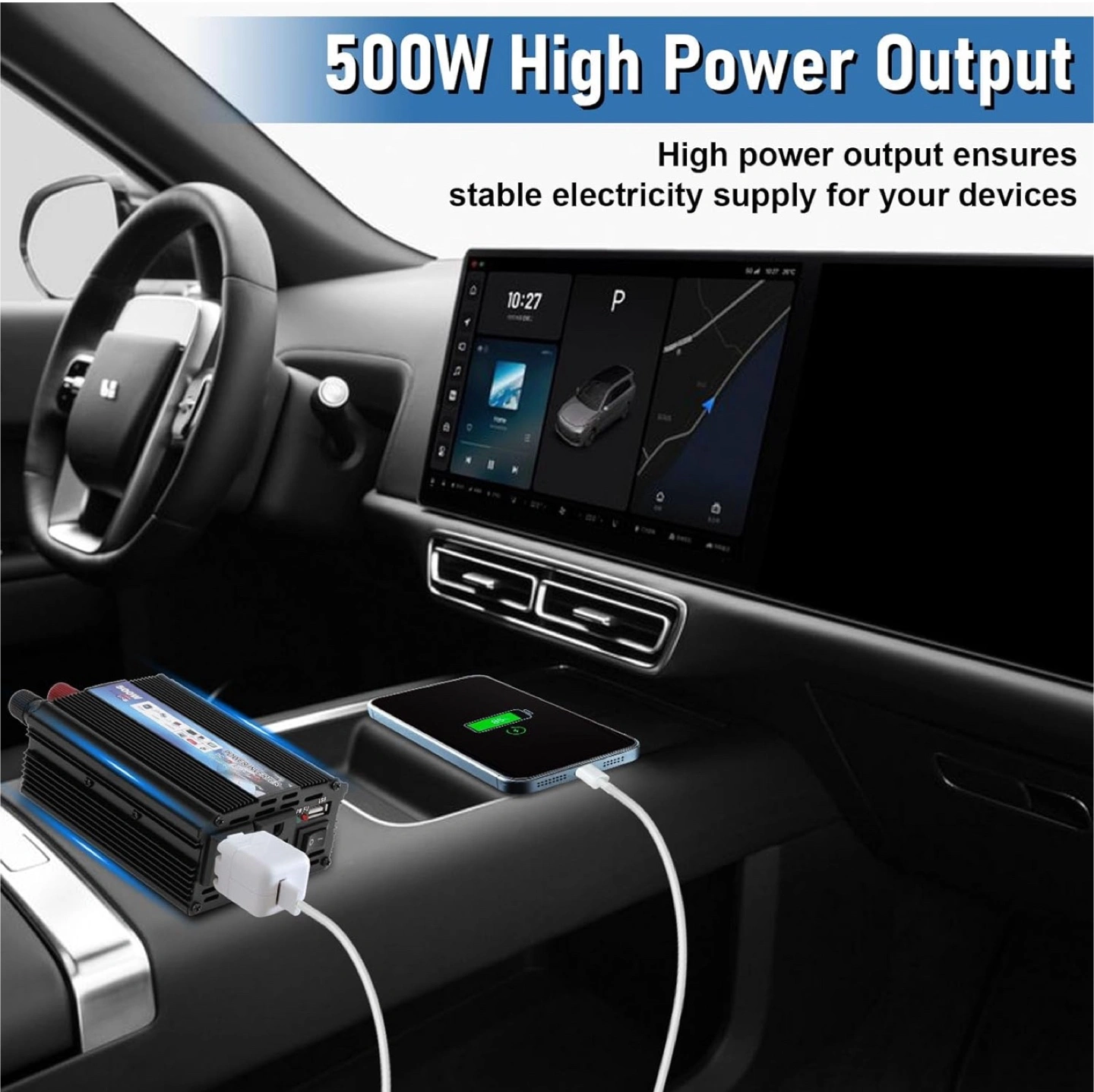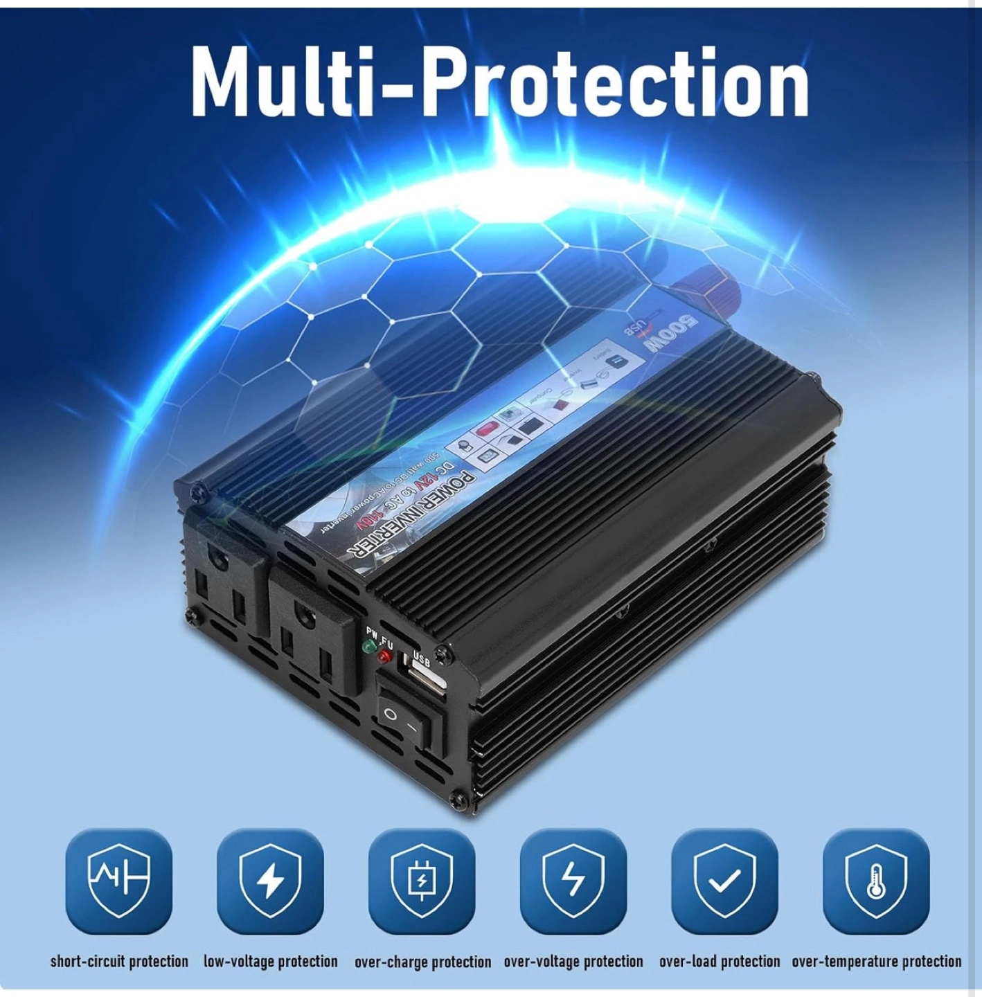 I'm selling a 500W Power Inverter, perfect for converting DC 12V to AC 110V. It's great for powering electronics, digital products, and charging outdoor appliances. Key features include: - DC 12V or 24V input, AC 110V/60Hz output - Fully functional protective circuit with over-voltage, overload, and inverse-protection - Conversion efficiency up to 90% - Smart cooling fan technology - Soft start function - Small size, light weight, and noise-free maintenance It comes with the box and all included components. It's a handy device for emergency jobs and household appliances