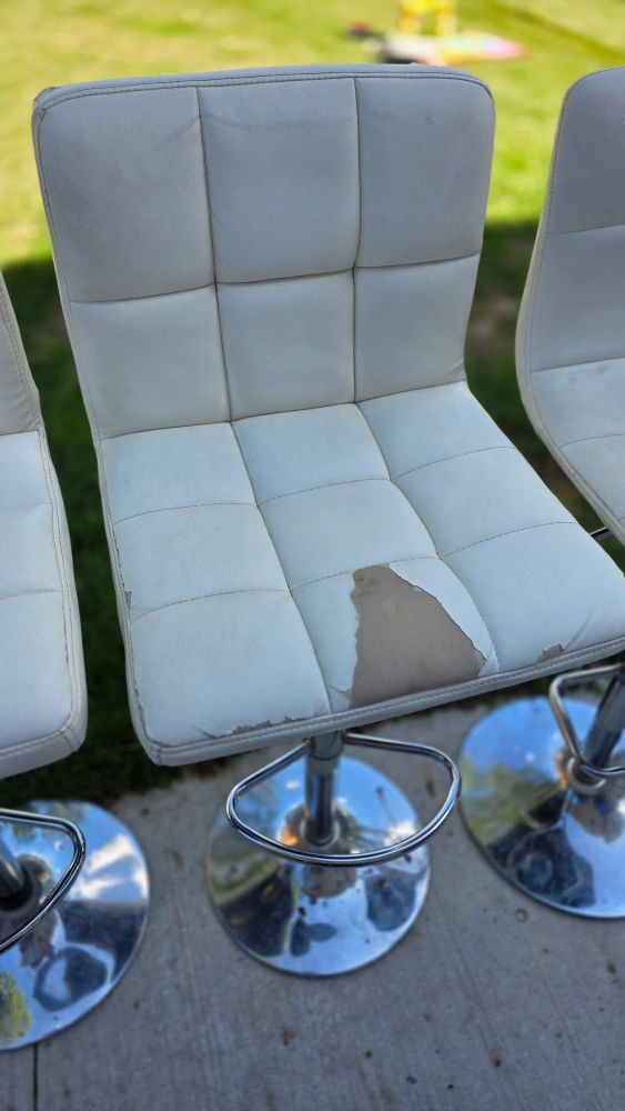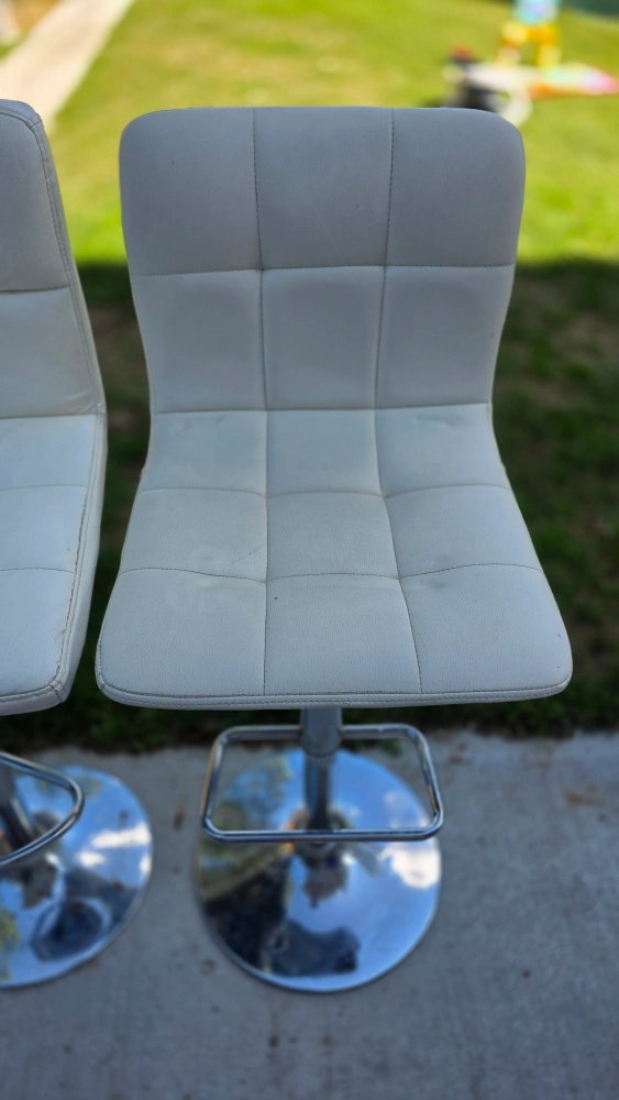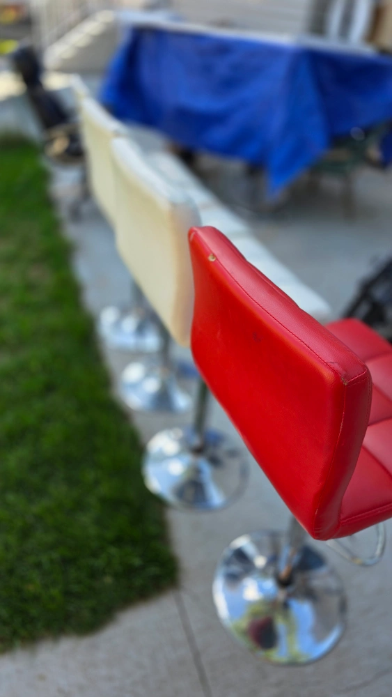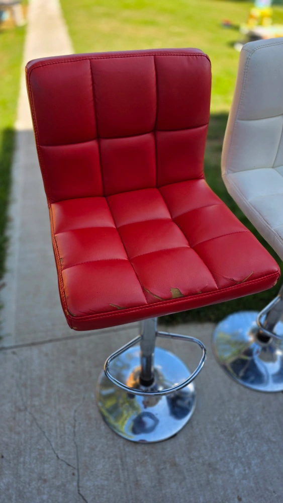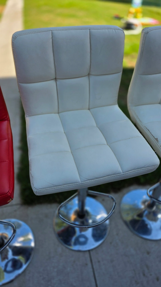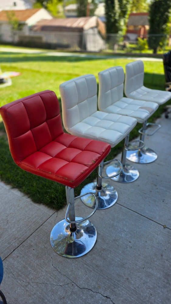 Selling these bar stools, perfect for your kitchen island or bar area! There's one red and three white stools. Please note that the red and white stools has some wear and tear on the seat, as shown in the pictures. Everything work great. Pick up at Delton area! _____ ALSO I CAN DELIVER!