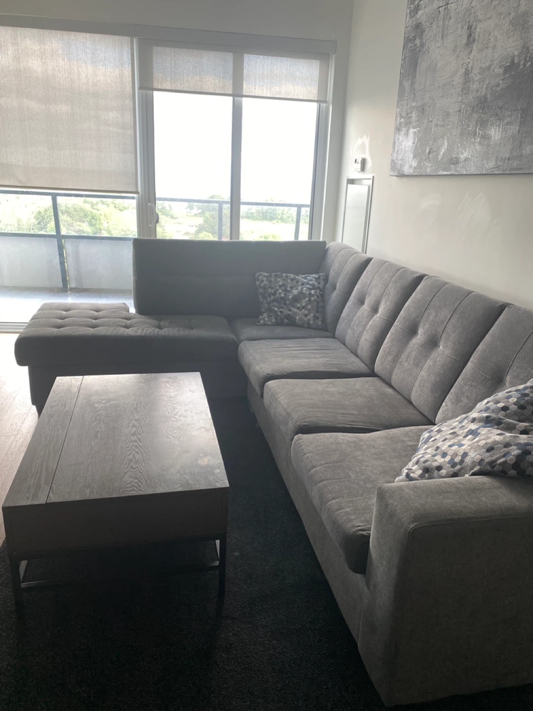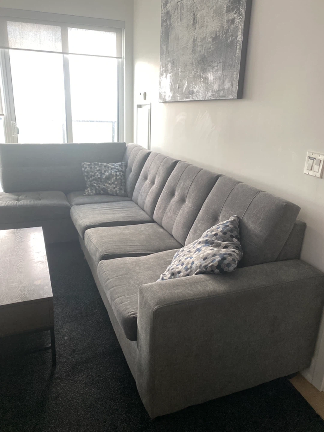 Selling a grey sectional sofa. It's in great condition and would be perfect for a living room or entertainment space. The sectional design offers plenty of seating and a comfortable place to relax after a long day. 1 year old. no smoking or pets not available before august 27. is a two piece