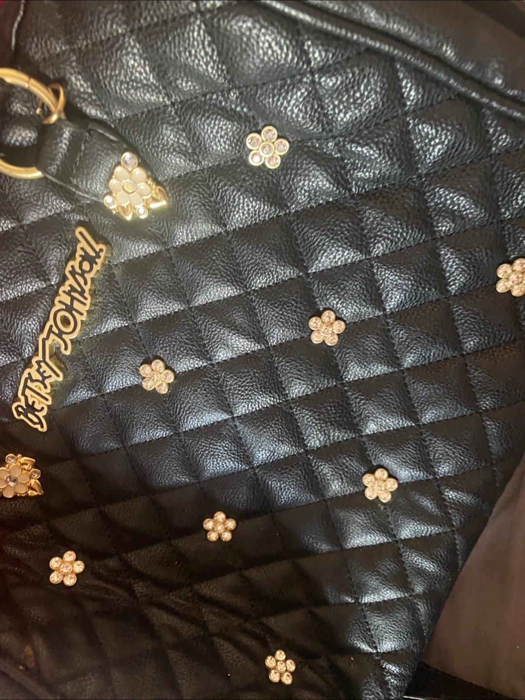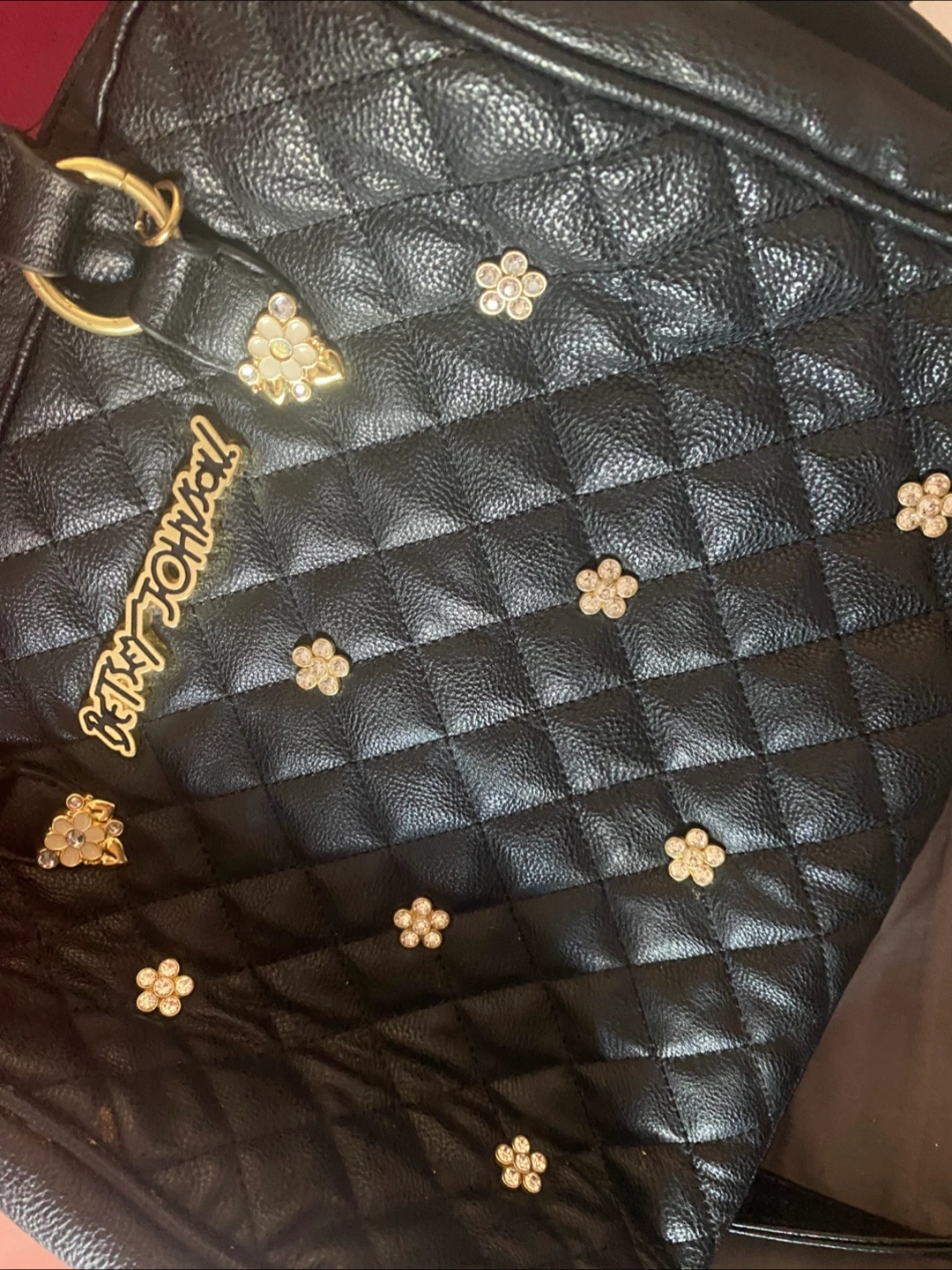 This is a Betsey Johnson black quilted purse. It has a quilted design with flower embellishments. Perfect for adding a touch of style to any outfit!