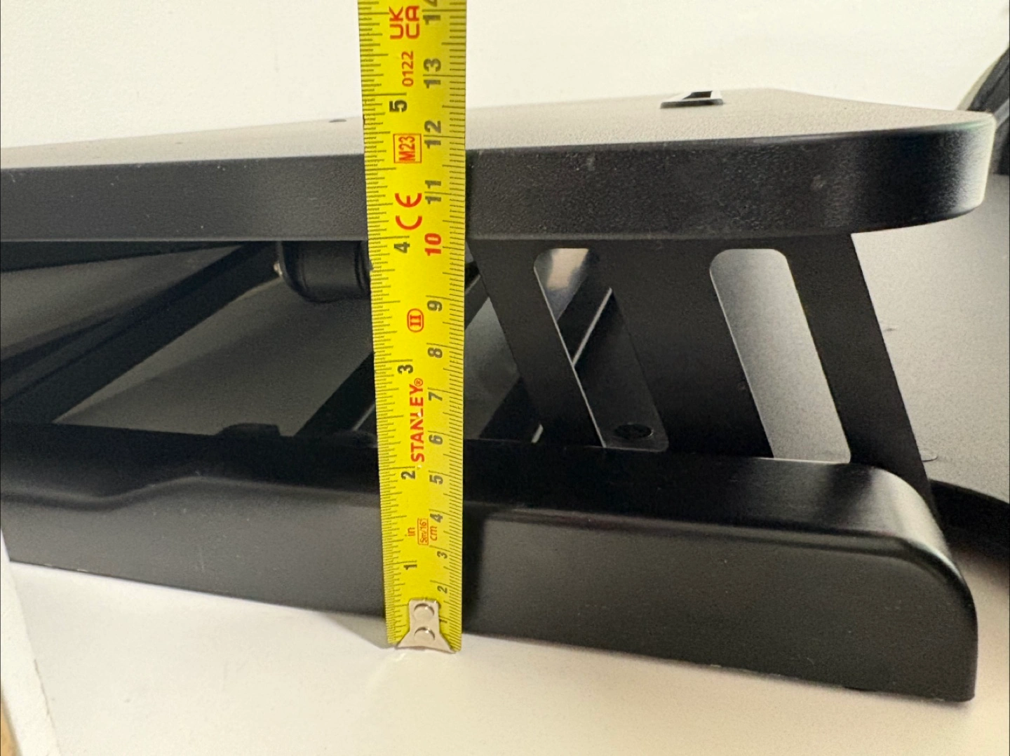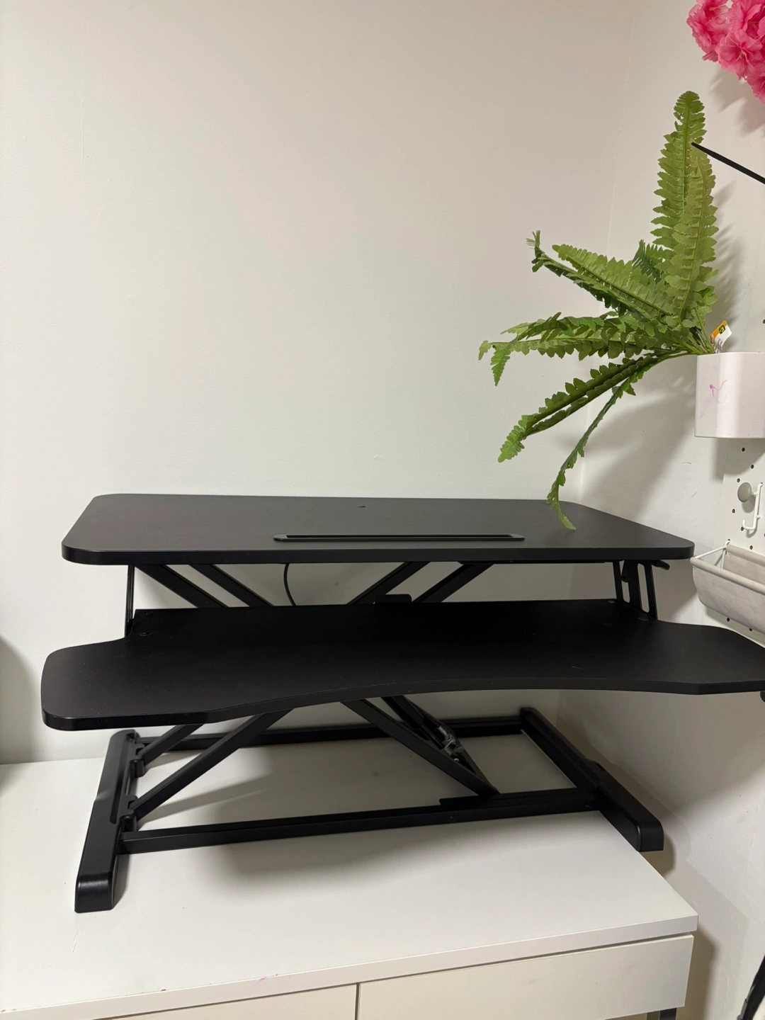 Looking to sell this black sit stand desk riser! It's in great condition and perfect for converting any desk into a standing workstation. It features a smooth and easy height adjustment mechanism, making it simple to switch between sitting and standing throughout the day. This has been sitting in the study room and barely used- just like new ! While I’m changing office this won’t be needed so feel free to take it home to help yourself with some easy standing time during work. Also it expand the space for work if you have a full tabletop work station. Dimensions are shown in the pictures - feel free to check them out and see if it fits on your table (it fits most table) .
