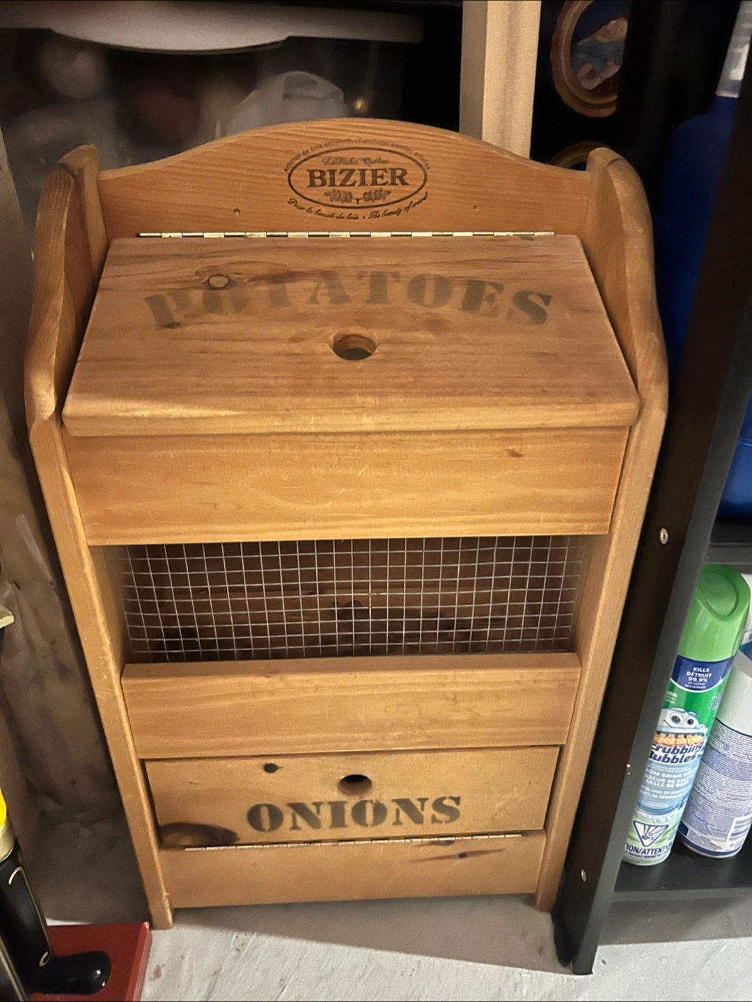 Selling a vintage Mizier potato and onion storage bin. It's a charming piece for your kitchen to keep your veggies organized!