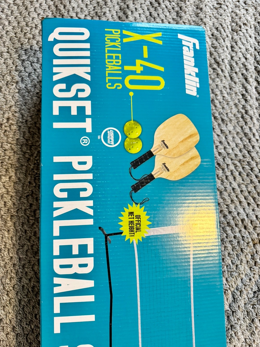 Get ready to play pickleball with this Franklin Quikset Pickleball Starter Set! It includes: - 2 wooden pickleball paddles - 1 Quikset pickleball net - 2 X-40 USAPA approved pickleballs The net is 10ft x 3ft (3m x 91.4cm). Perfect for some fun in the sun!