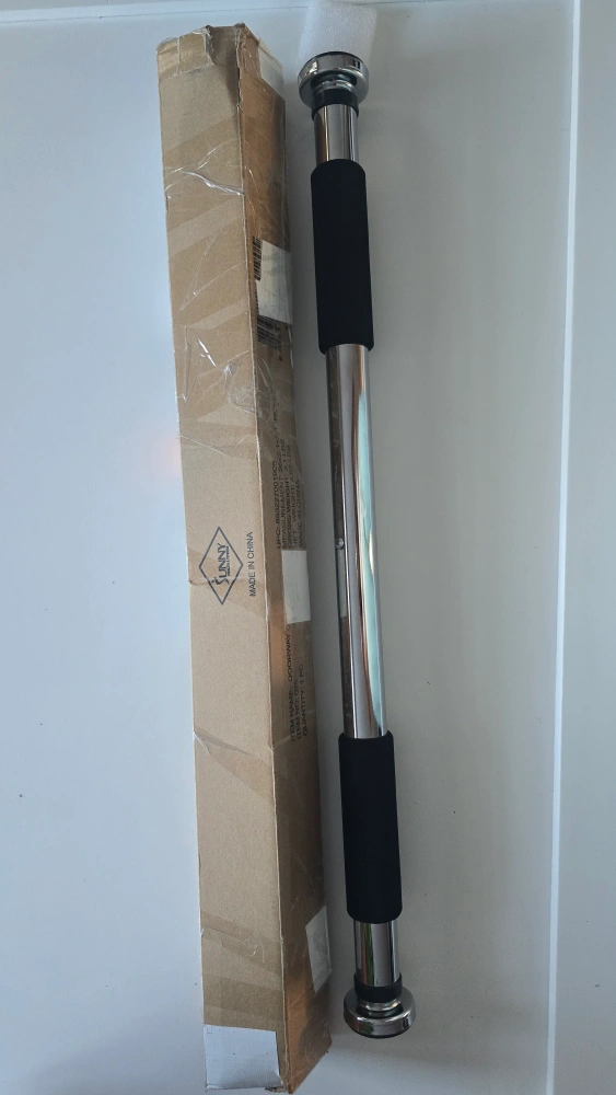 Sunny Health & Fitness doorway chin up bar! It's new and comes with the original box and all included components, including screws and brackets. The measurements are 26 x 1 x 2.1 inches. Great for getting in a quick workout at home!