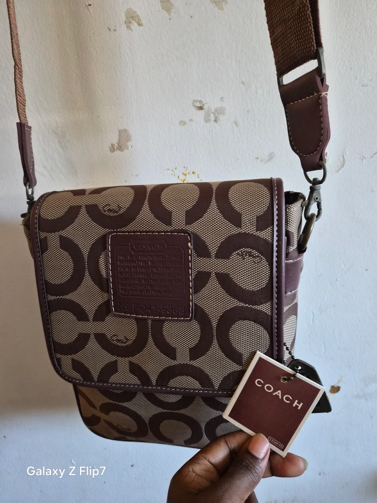 Here's a cute Coach crossbody bag with a brown patterned design. It's perfect for carrying your essentials while keeping your hands free. The bag features a comfortable strap and a stylish look that goes with any outfit