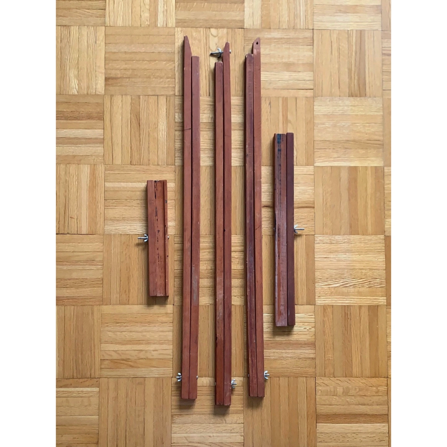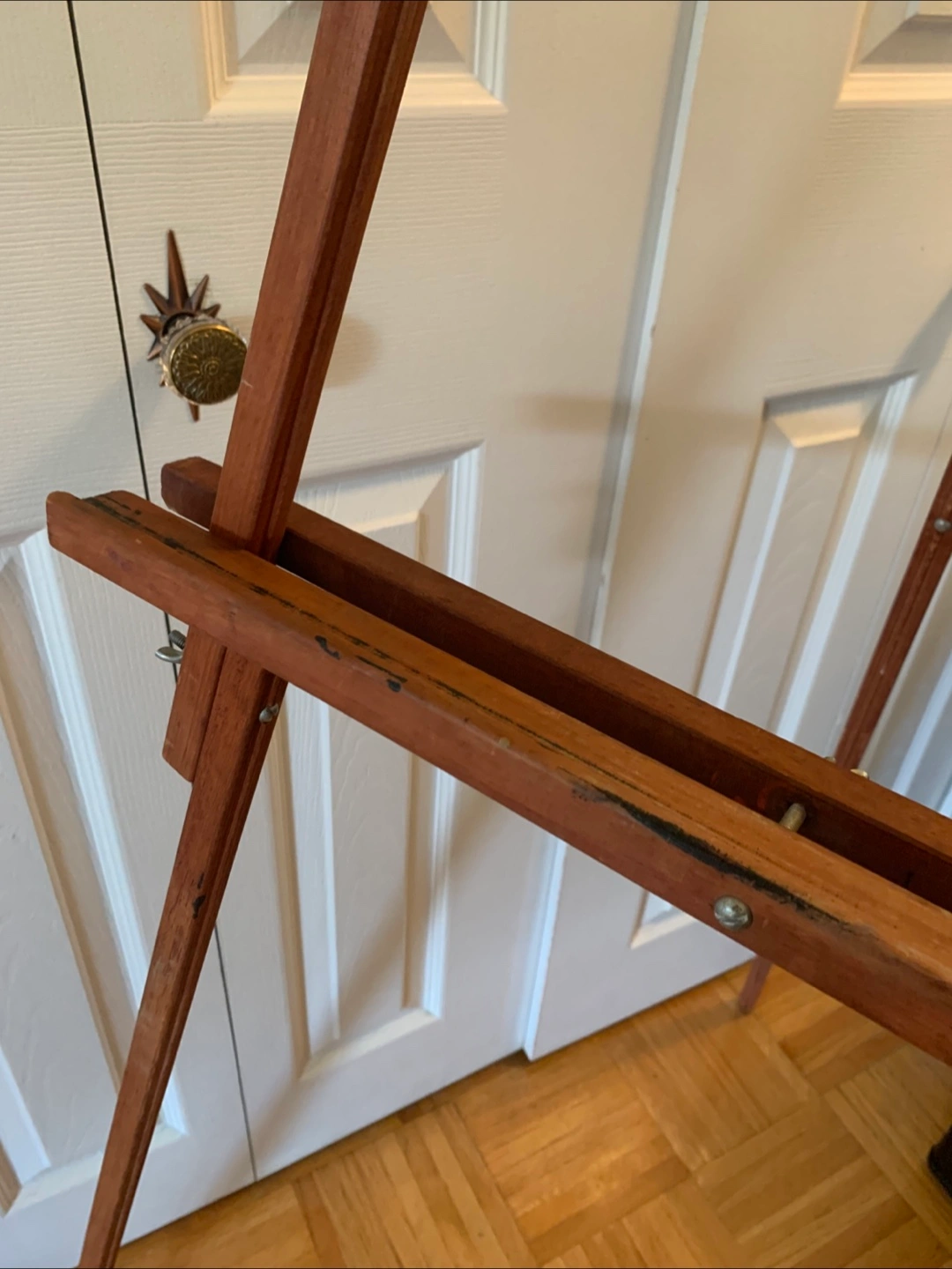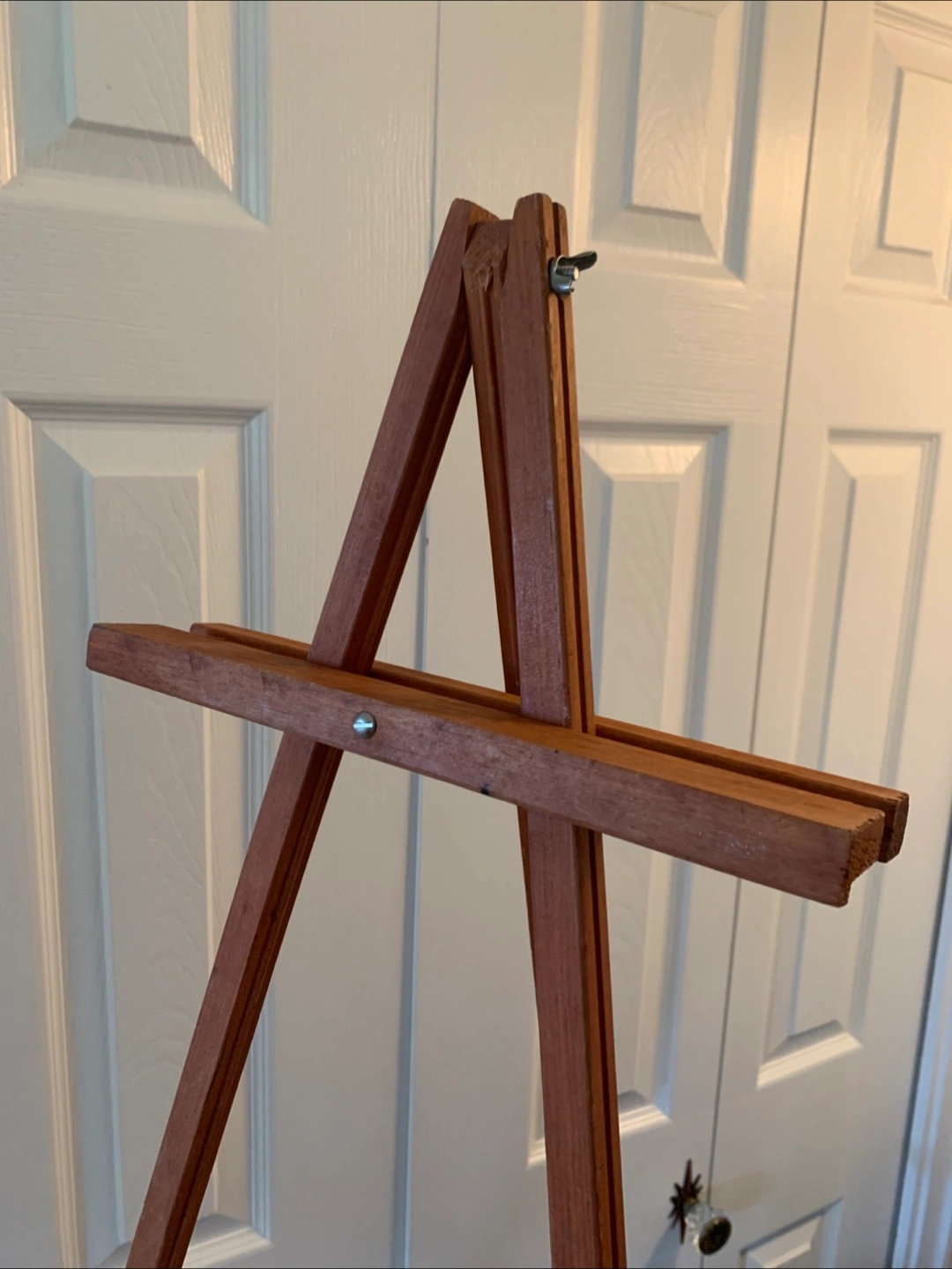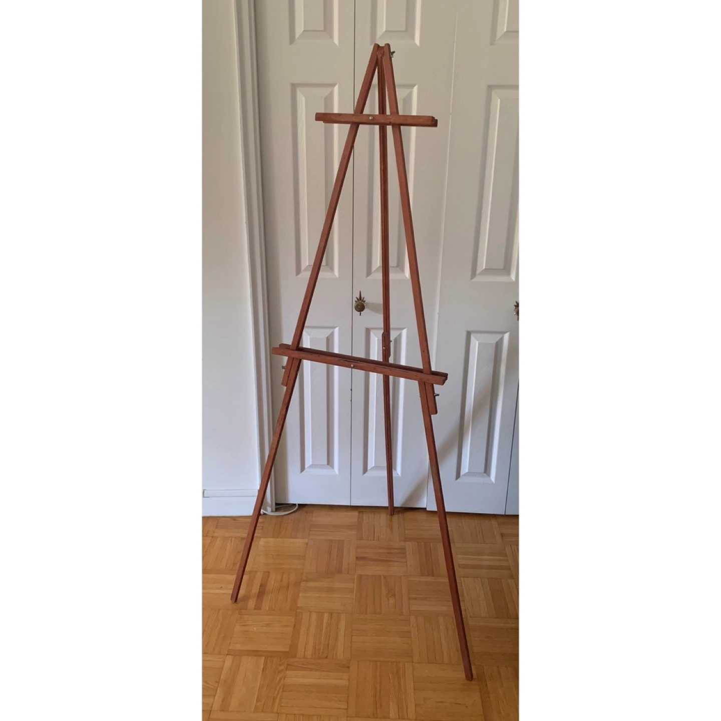 Adjustable and collapsible wooden easel with character from past use, including paint markings. A charming, functional piece to create on or to display art in a living room or studio. Wood is reddish brown. Completely disassembles for transport and storage. Uses screws with wing nuts. Approximate Measurements: 64” (5.33 feet) Tall 3/4” Thick Wood 11 1/3” Top Ledge Width 19 1/4” Bottom Ledge Width Pick Up Only at Lonsdale and Spadina Road.