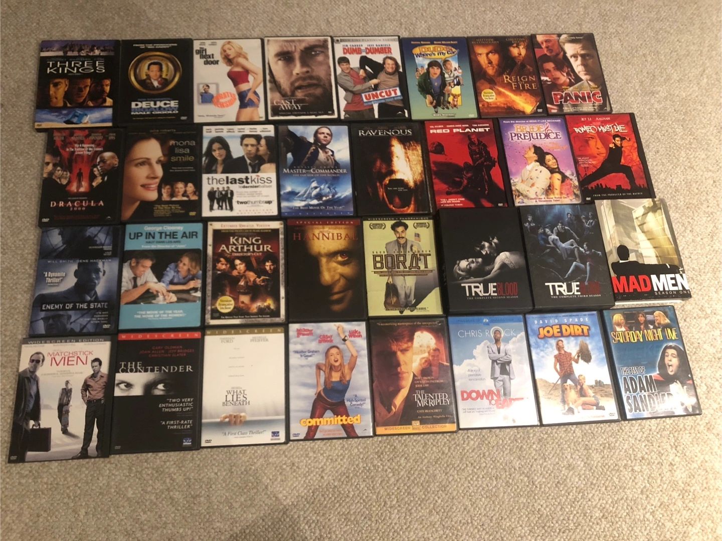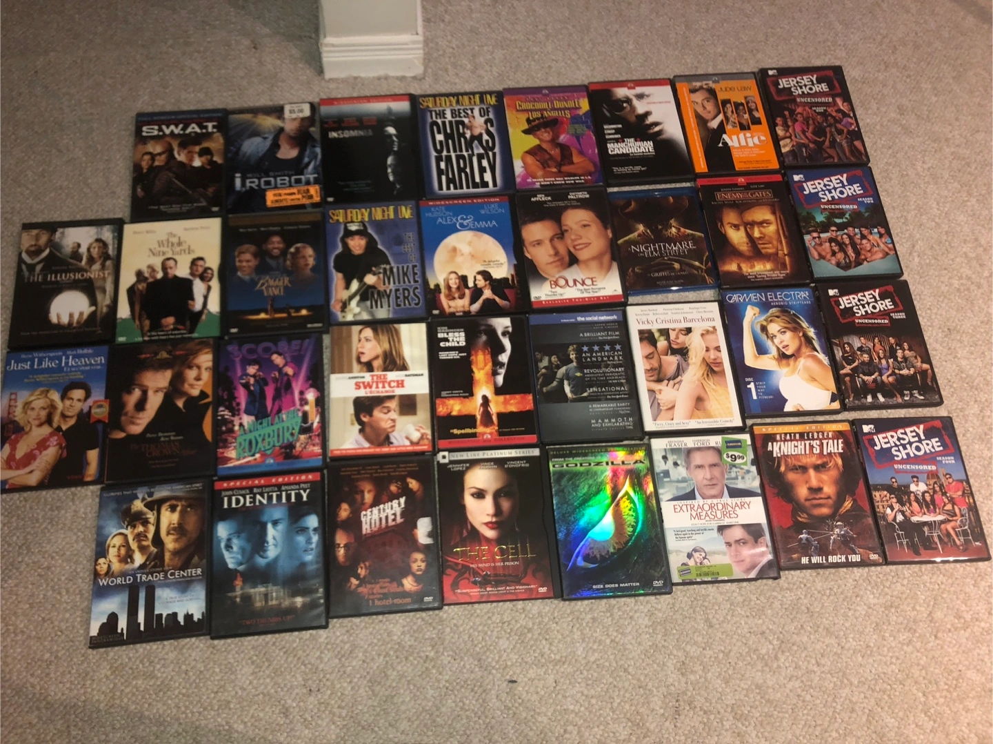 Blu Ray A Nightmare on Elm Street DVDs TV Shows True Blood-2rd season True Blood-3rd season Mad Men-1st season Jersey Shore uncenceroed 1st season Jersey Shore uncenceroed 2nd season Jersey Shore uncenceroed 3rd season Jersey Shore uncenceroed 4th season DVDs Movies Romeo Must Die Bride & Prejudice The Last Kiss Master & Commander Ravenous Red Planet Mona Lisa Smile Dracula 2000 Three Kings Reign of Fire Panic Dude Where’s my car? Dumb and Dumber Cast Away Joe Dirt Match Stick Men Down to Earth The Girl Next Door Duce Bigalow King Arthur The Contender What Lies Beneath Committed The Talented Mr Riply Enemy of the State Up in the Air Emeny at the Gates The Tomas Crown Affair The Whole Nine Yards The Legend of Bagger Vance Insomnia I-Robot Bounce Alex & Emma Alfie Hannibal Borat The Manchurian Candidate Crocodile Dundee in LA SNL Best of Chris Farley SNL Best of Adam Sandler SNL Best of Mike Meyers Carmen Electra’s Aerobic Striptease Disc 1 S.W.A.T The Switch A Night at the Roxbury Vicky Cristina Barcelona The Social Network Bless the Child A Knights Tale Extraordinary Measures Godzilla Just Like Heaven The Illusionist Century Hotel Identity World Trade Center The Cell