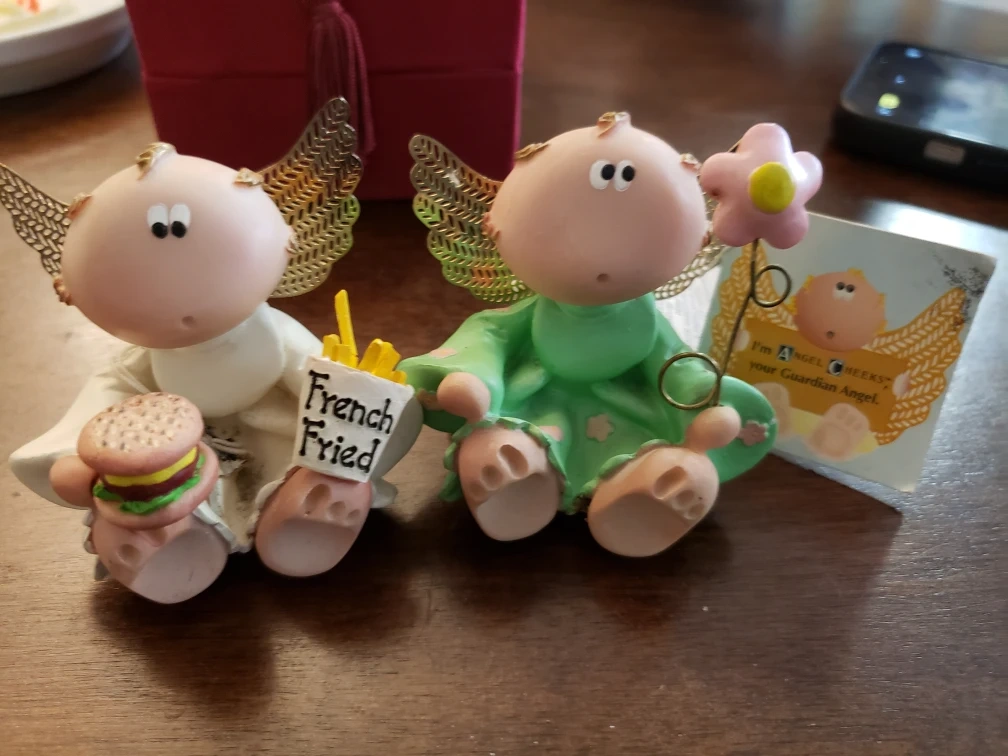 Two cute Angel Cheeks figurines! One is holding a burger and fries, and the other has a flower. They would make a sweet addition to any collection or a thoughtful gift