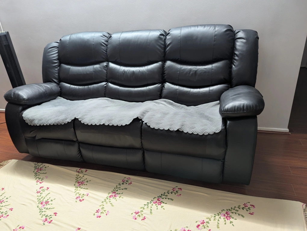 Selling a comfy black leather reclining sofa. It's in good condition and would be perfect for a living room or entertainment area. The only issue is surface is getting peeled off from few places.The sofa features reclining seats and a centre console with cup holders. No pets and No kids.