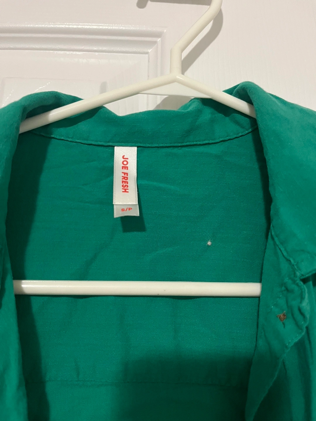 A lovely green button-up shirt from Joe Fresh in size small! It's in great condition and ready for a new home. Perfect for layering or wearing on its own, this shirt is a versatile addition to any wardrobe