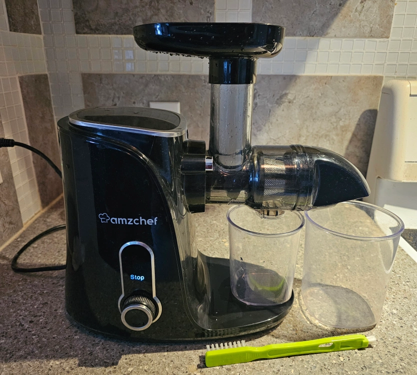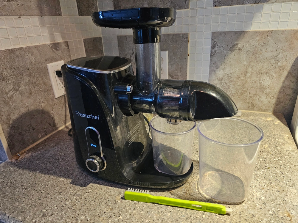 Amzchef great juicer me and all my friends love the fresh juice it makes bought 6 month ago for $150, works great, it can cold press from apple/carrots to ginger everything fully to dry pulp, am selling cause moving to another country. • Two Speeds Control: AMZCHEF juicer has flexible 2-speed modes to extract various fruits and vegetables. 'SOFT' mode runs from 50 to 60 RPM for soft fruits like citrus,lemon, strawberry, orange, beets etc. 'HARD' mode runs from 100 to 110 RPM for hard fruits like apple, celery, carrot, ginger etc. AMZCHEF juicer machine is suitable for soft or hard fruits and vegetables. • Higher Juice Yield: With slow extraction technology, AMZCHEF cold press juicer can preserve maximum nutrients of the fruit and vegetables and extract higher juice yield. The juicer also features an 7 levels upgraded spiral auger that ensures full grinding of the fruits and vegetables. This cold press juicer machine can perfectly separate the pulp and the juice. Therefore, you can get drier pulp and purer juice. Make Safe & Healthy Juice: All detachable parts of our fruit juicer machine are made of high quality food grade anti-oxidant materials. The materials of our fruit juicer are BPA free, perfect for babies, kids, and adults. All the accessories are durable. We are committed to providing you with safe and healthy juice. • Easy to Disassemble & Clean: AMZCHEF slow juicer is easy to be assembled and disassembled in seconds with its one-button disassembly design. Our juicer machine has REVERSE FUNCTION to avoid stuck and reduce clogging. Our slow juicer cold press is also equipped with a cleaning brush so that you can clean the machine easily. • Quiet and Stable Operation: The motor of AMZCHEF masticating juicer can always runs at a low speed of less than 60 decibels, so you can enjoy your early-morning juice without bothering your family or neighbors. Compact design does not occupy much kitchen space and makes the juicer maker easier to move and use.