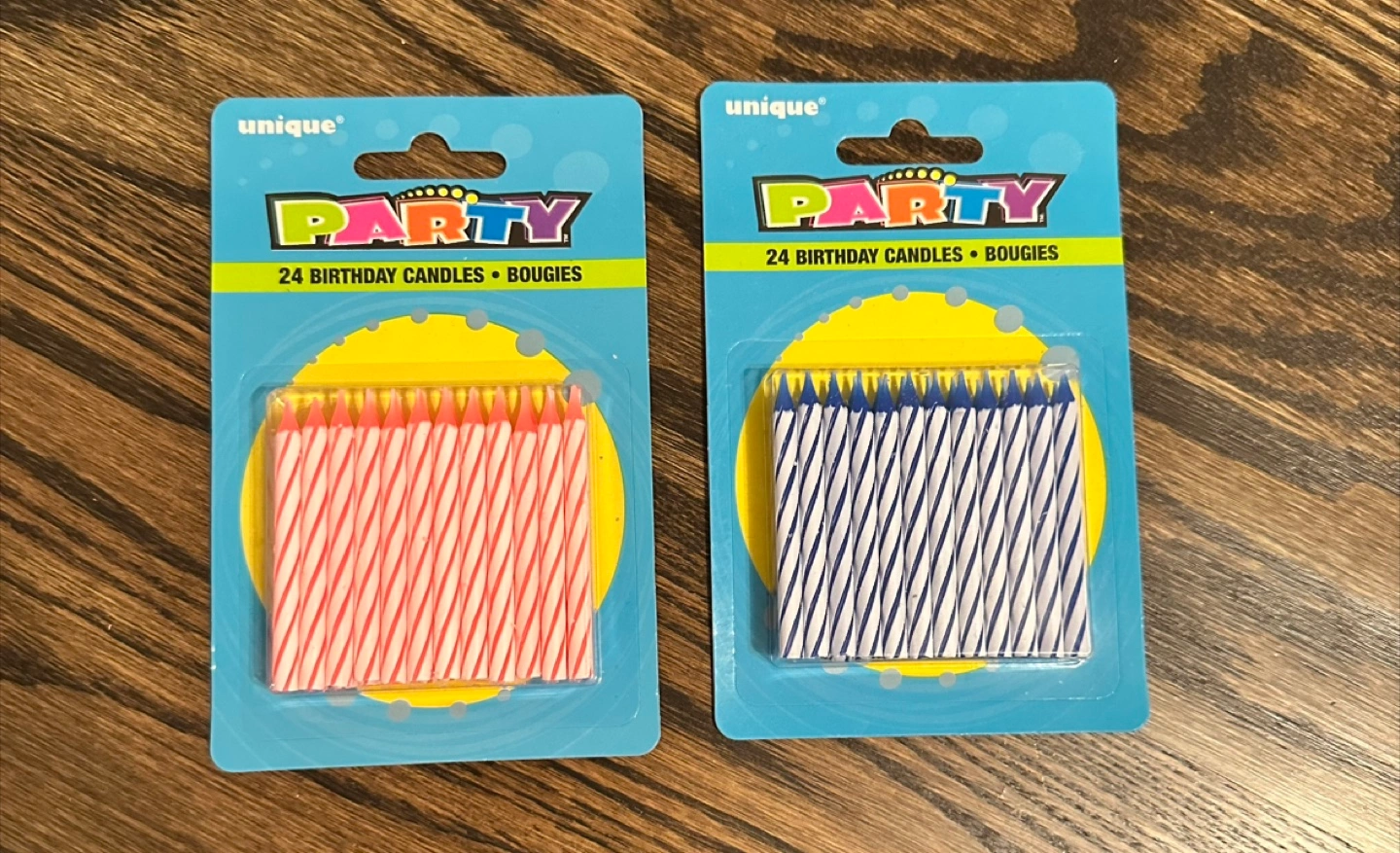 I'm selling two packs of birthday candles from Unique Party. One pack is pink and white striped, and the other is blue and white striped. Each pack contains 24 candles and they are brand new in the packaging $1 each