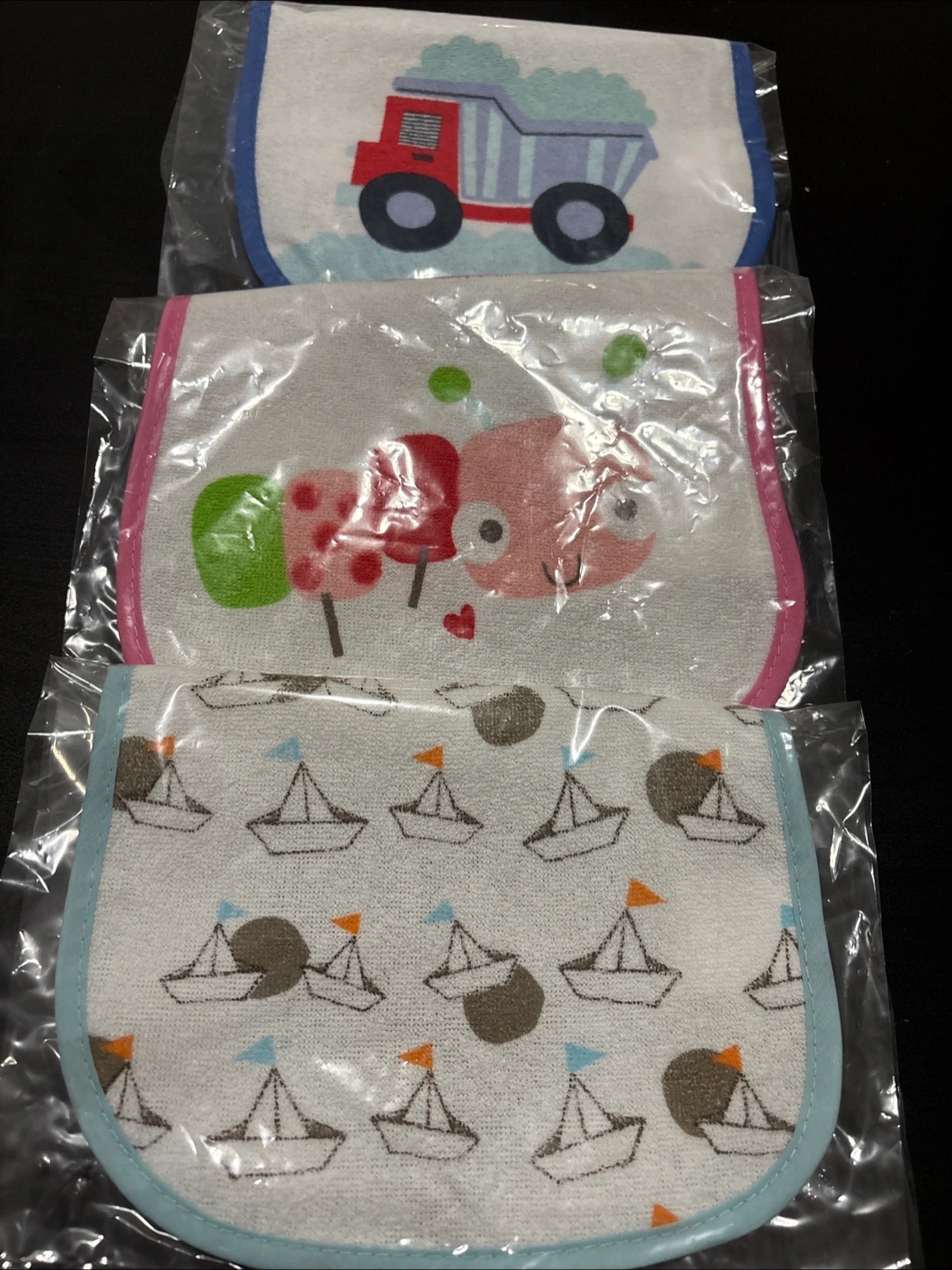 I have a set of three brand new baby bibs, still in their original packaging! They feature cute designs: a dump truck, a bee and sailboats. Perfect for keeping your little one clean during meal times!
