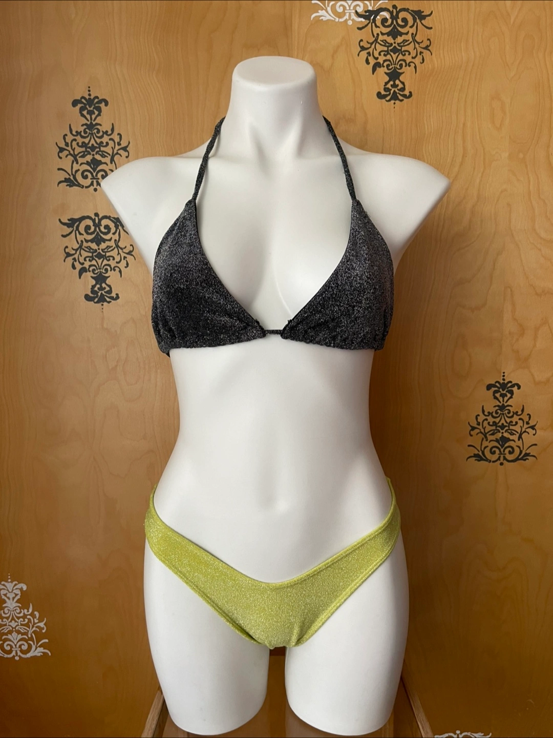 Vintage 2000s Y2K Sparkly Black & Yellow String Bikini Set Brazilian Bottoms S/M Stylish black and yellow/green tint shade bikini set perfect for a day at the beach. Enjoy comfort and style with this eye-catching swimwear. Condition: 10/10! Never worn -New Without Tag! Style Details Top: VERY Y2K style Color: sparkly black - shimmery - VERY 90s/2000s style & colour vibes Adjustable tie up string bikini halter top Thick supportive straps Not only is this swimsuit top glamorous, but it also gives maximum support Straps tie behind neck Maximum support & lining Bottoms: Amazing colour sparkly neon yellow/green tint Classic Brazilian bikini bottoms High cut & cheeky coverage Comfortable and glamorous Seamless Slight front V-Cut Fabric: 80% Nylon, 11% Spandex, 9% Metallic | 80% Nylon, 20% Spandex Measurements Inches: Mannequin is size Medium Top Tag Size: S/M US: 8-10 Bust: 34-36 Cup Size: B-C Bottoms: Small Waist: 27-29 Hips: 37-39