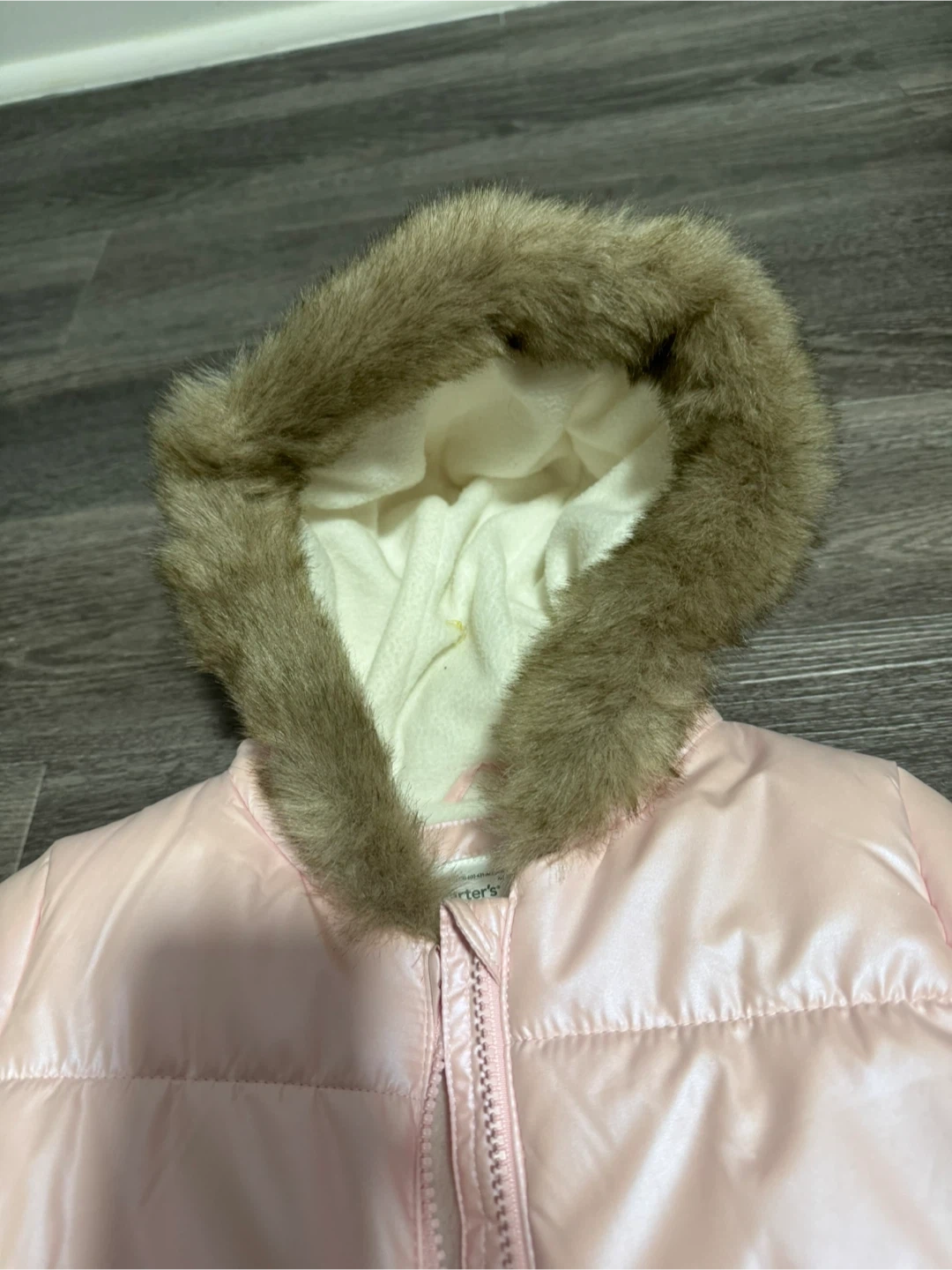 A cute and cozy Carter's snowsuit for your little one! This pink snowsuit is perfect for keeping your baby warm during the colder months. Waterproof material on the outer side. It's in great condition and sized for 6-9 months. Keep your littlest cozy and covered all winter long in this 1-piece snowsuit. Complete with a double-front zip closure for easy on-and-off over baby's winter outfits, removable mittens and booties for easy access to hands and feet, and a faux fur-trimmed hood adds extra warmth from head to toe. Features: Front-zip diagonal closure Fold-over hands and feet Inner soft closure Faux-fur trim on hood Fleece lining Fabric & Care: 100% poly Imported Machine washable Used just a couple of times. Originally bought for $57cad