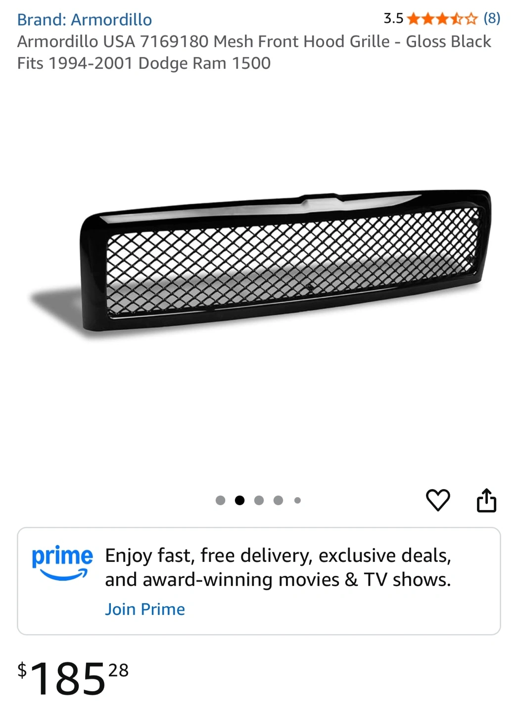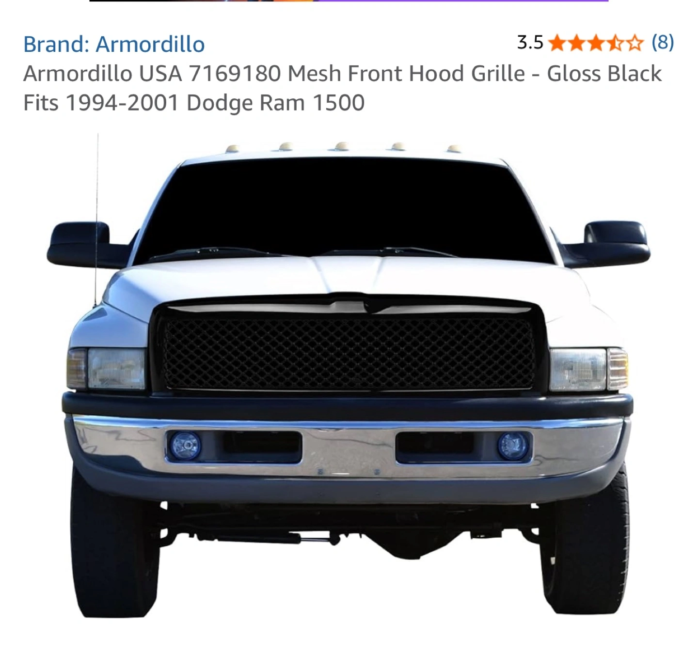 Armordillo USA 7169180 Mesh Front Hood Grille - Gloss Black Fits 1994-2001 Dodge Ram 1500 Retail Amazon: $185.28 + tax Tdot: $299.54 sale $249.62 + tax Asking: $125 Brand new never installed In box and packaging opened for photos Pick Up Waterdown Area