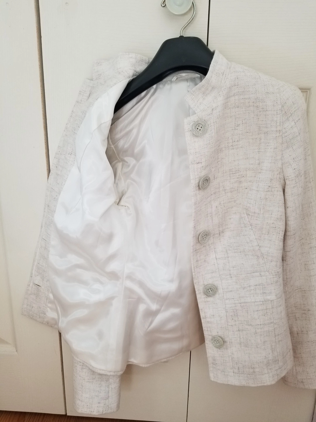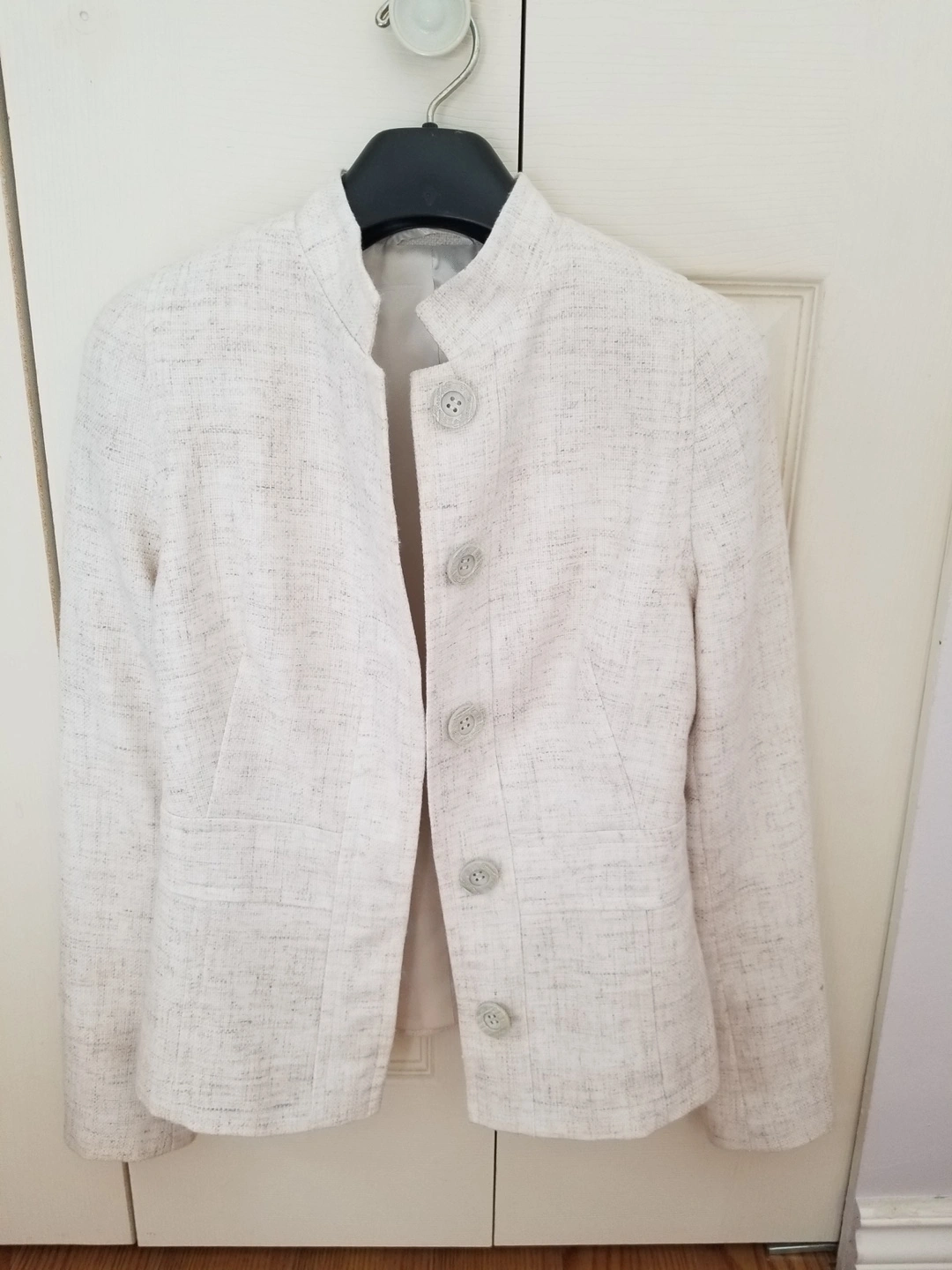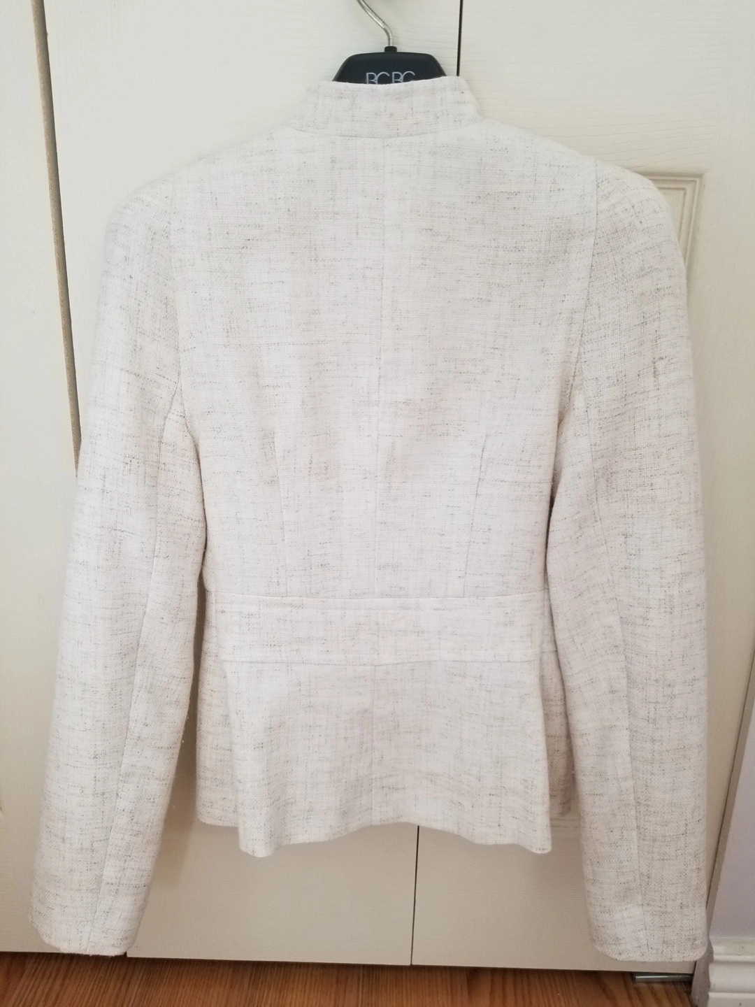A lovely beige blazer from BCBG, perfect for adding a touch of class to any outfit! It's a size 6 and in great condition. The material has a nice subtle texture. Perfect for work or a smart casual look!