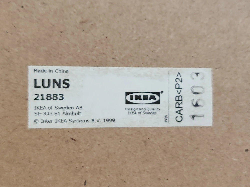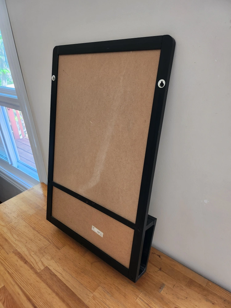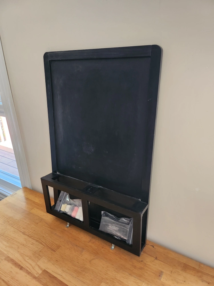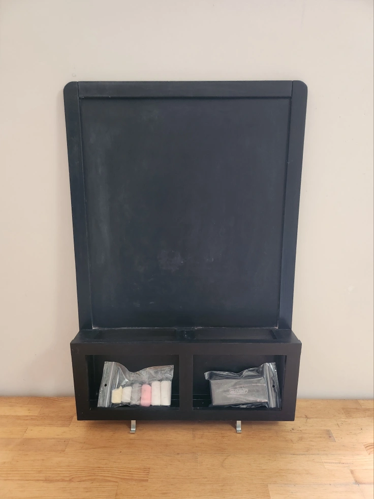 Chalkboard from IKEA, model LUNS. It comes with a handy shelf at the bottom for storing chalk and erasers. Has 2 hooks on the base for hanging small items. Great for a home office or kid's room!