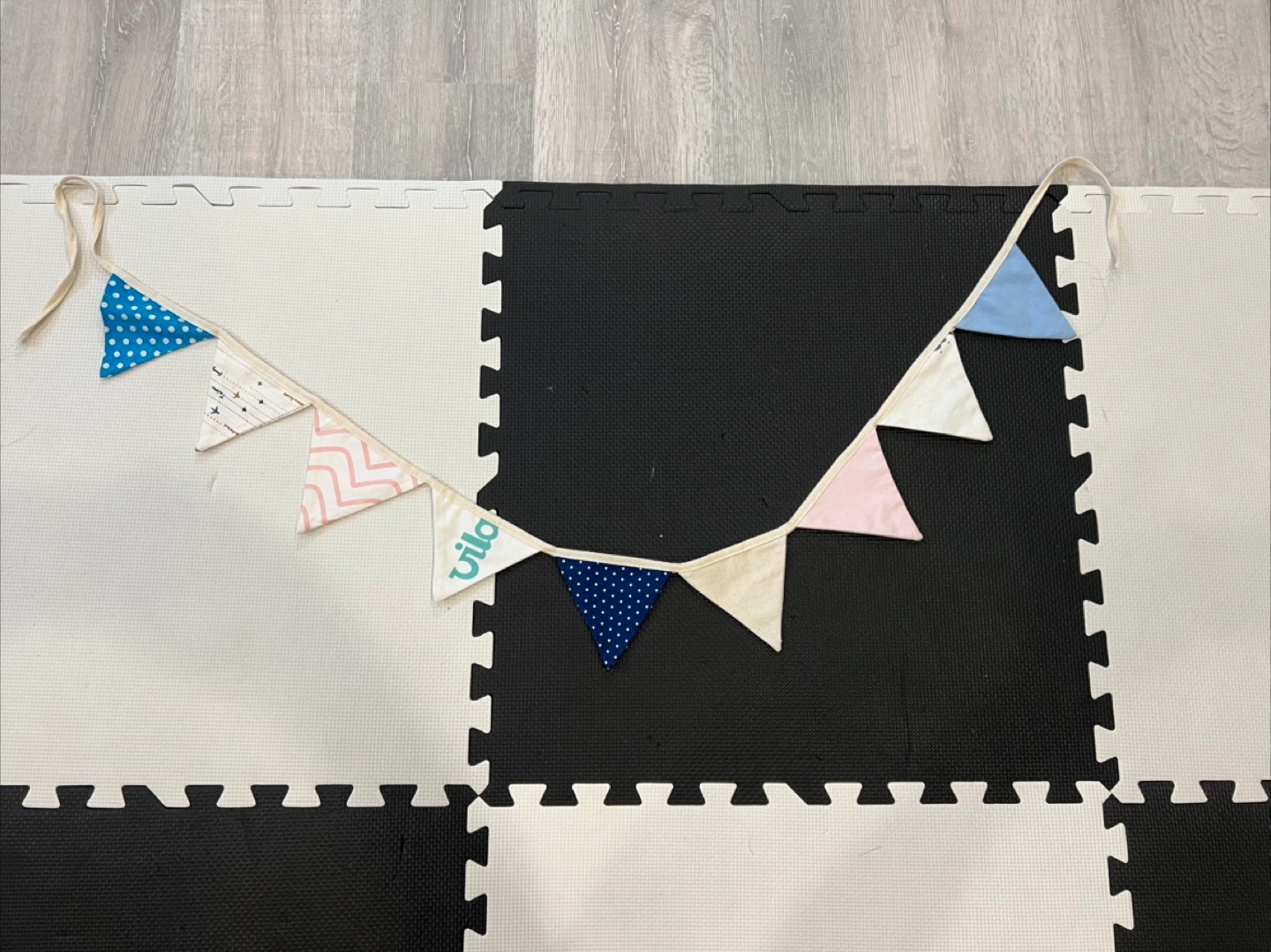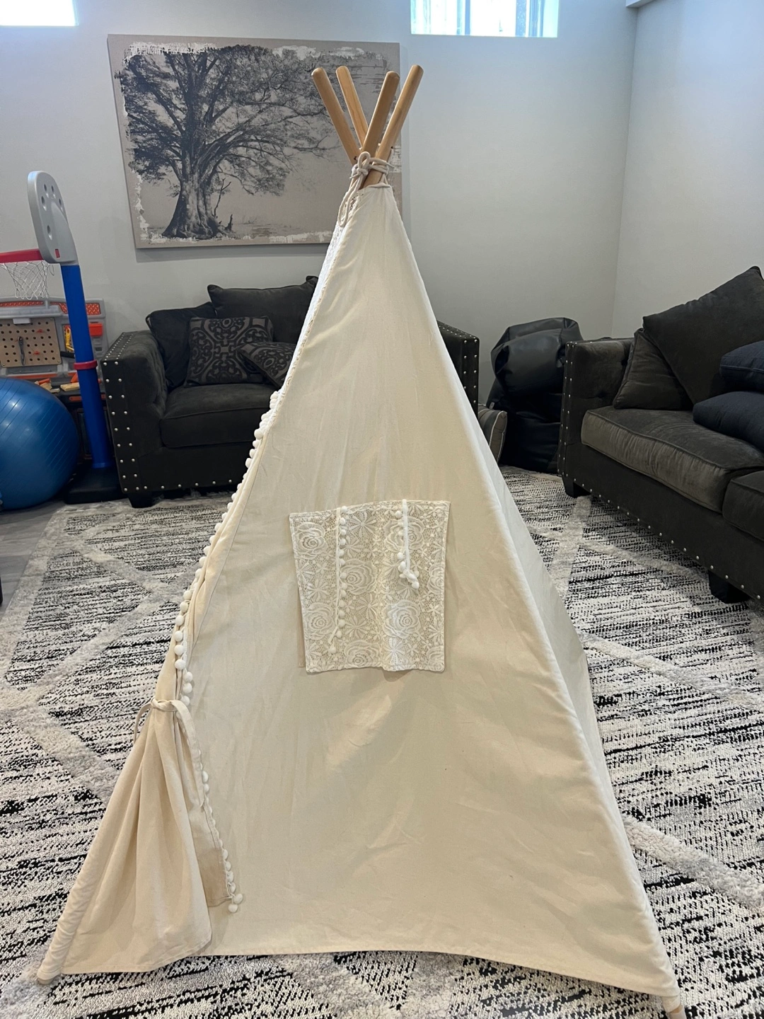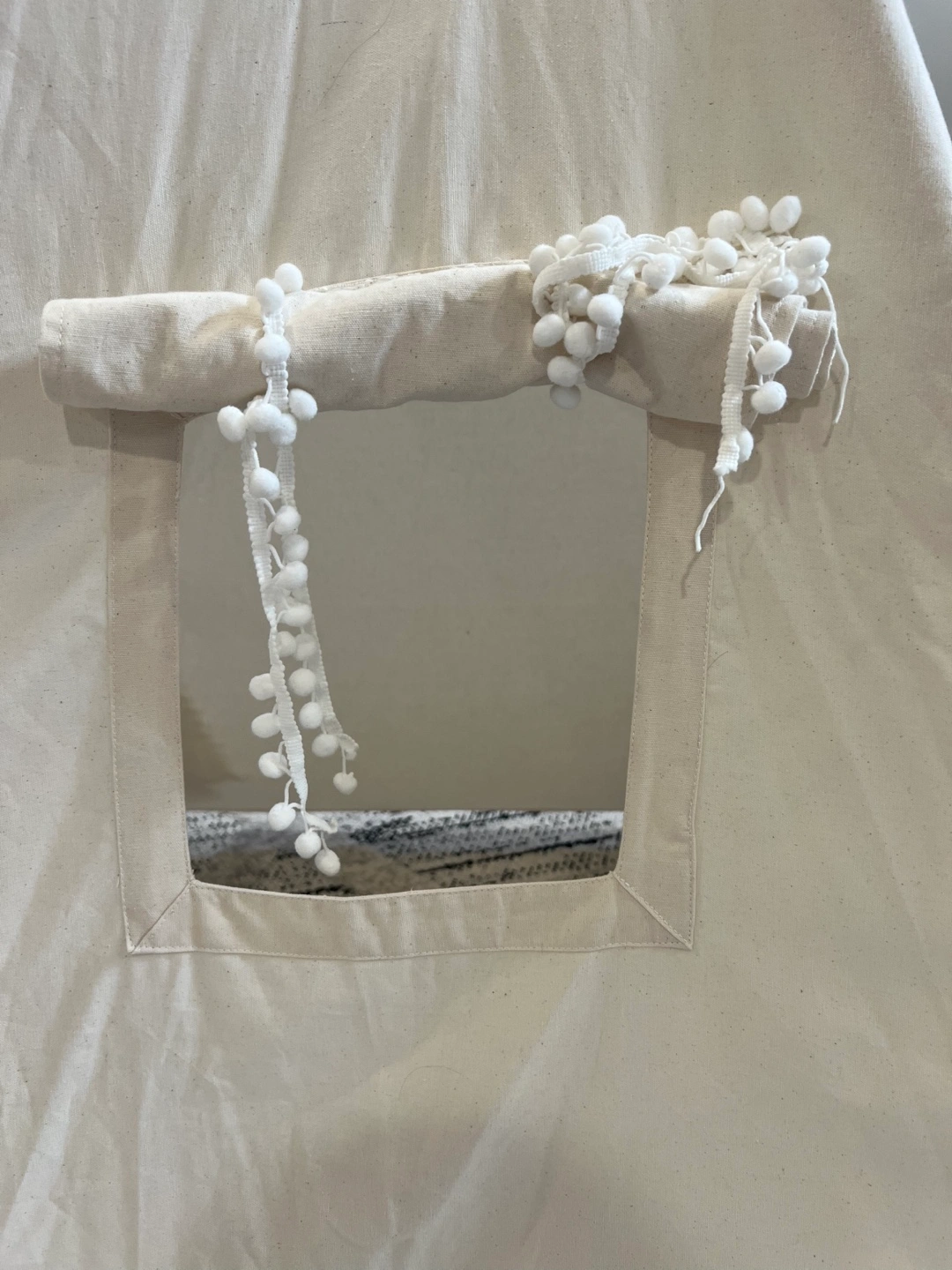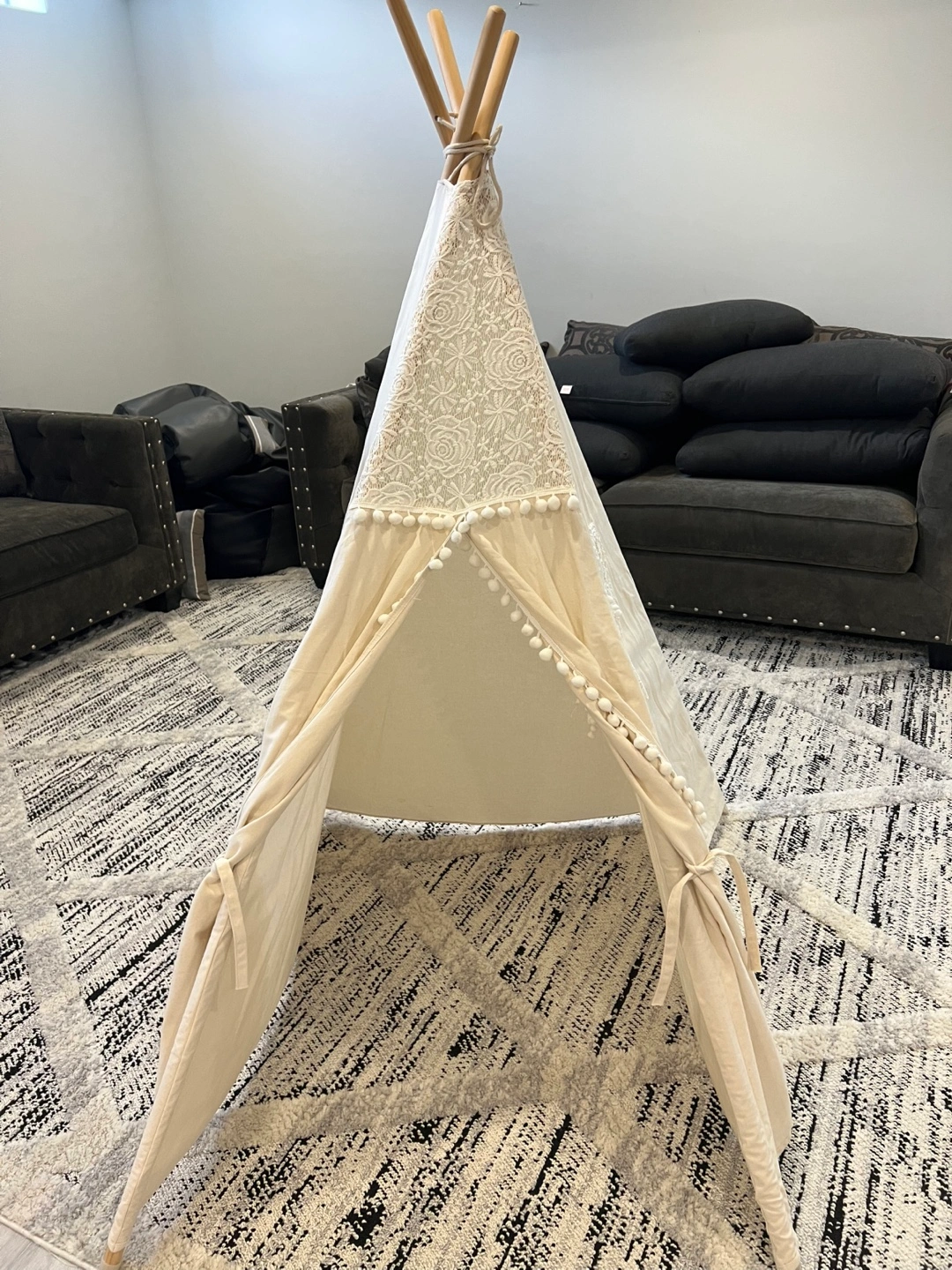 Cream coloured tent with lace detailing. Has ties on either side of the opening to tie back (see pictures) and also to tie the lace window open. Comes with banner. It’s approx 4ft by 3.5ft when open, measured at the base of the triangles and about 5ft tall in total (a little less inside).