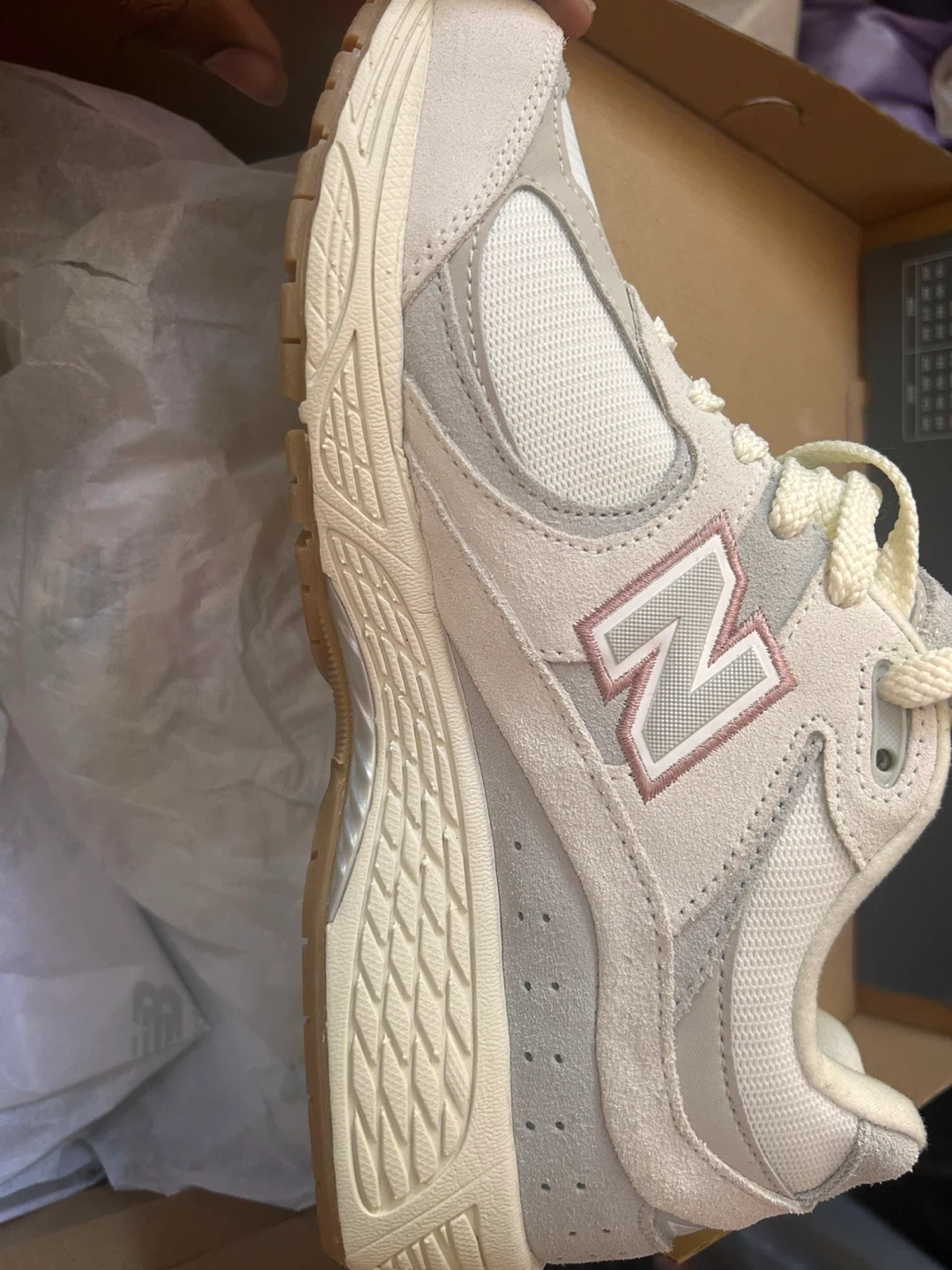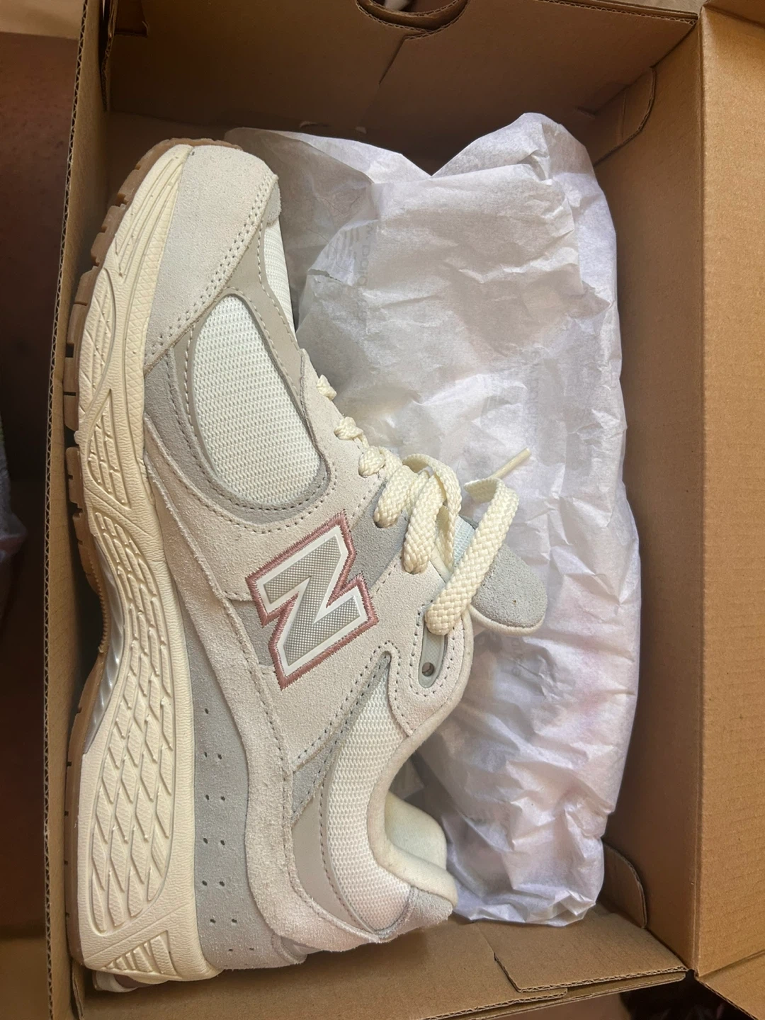 Selling a pair of New Balance 2002R shoes in size 9.5w/m8. They are in new condition and come with the original box! The shoes feature a stylish design with a mix of white and grey tones, and are very comfortable making them perfect for everyday wear