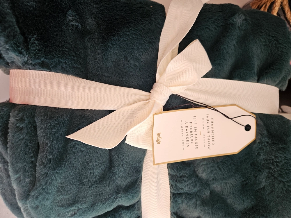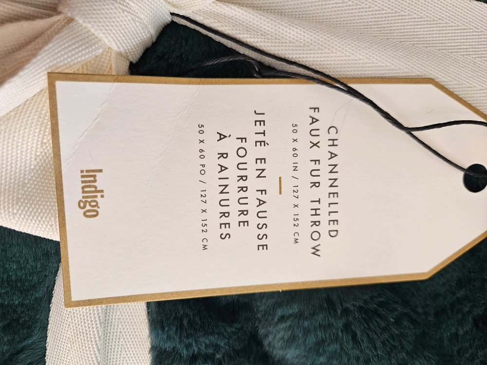 Snuggle up with this super soft channeled faux fur throw from Indigo! It's brand new with tags and measures 50 x 60 inches (127 x 152 cm). The colour is a beautiful deep green. Sfpf Oshawa Harmony Road South at 401