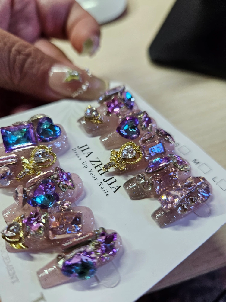These Jia Zhi Jia press-on nails are perfect for dressing up your nails! They feature a handmade brand enhancement with beautiful jewel embellishments. Sizes range from XS to L. A great way to add some sparkle to your look! size L