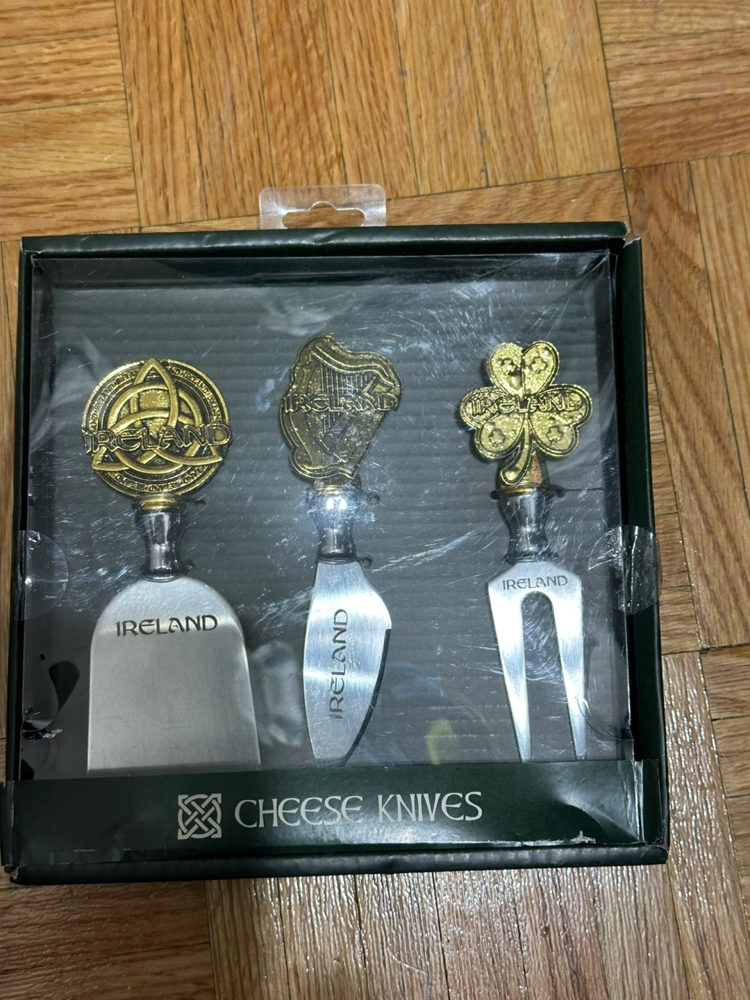 Selling a brand new set of cheese knives from Ireland, still in the original packaging! This set includes three unique knives, each with a different design representing Irish heritage. Perfect for adding a touch of Ireland to your next cheese board