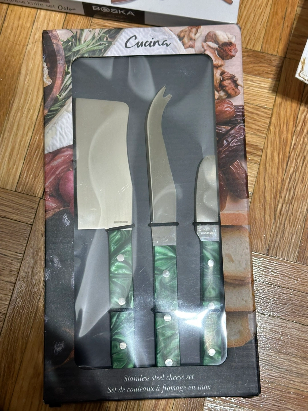 Selling a stainless steel cheese knife set from Cucina! It comes with three different knives for all your cheese needs. The handles have a beautiful green marbled design. Perfect for entertaining or a gift for the cheese lover in your life!