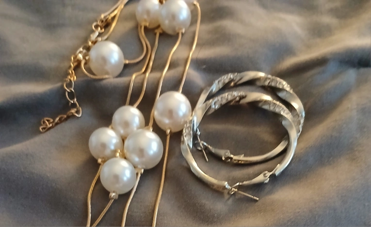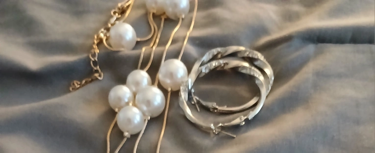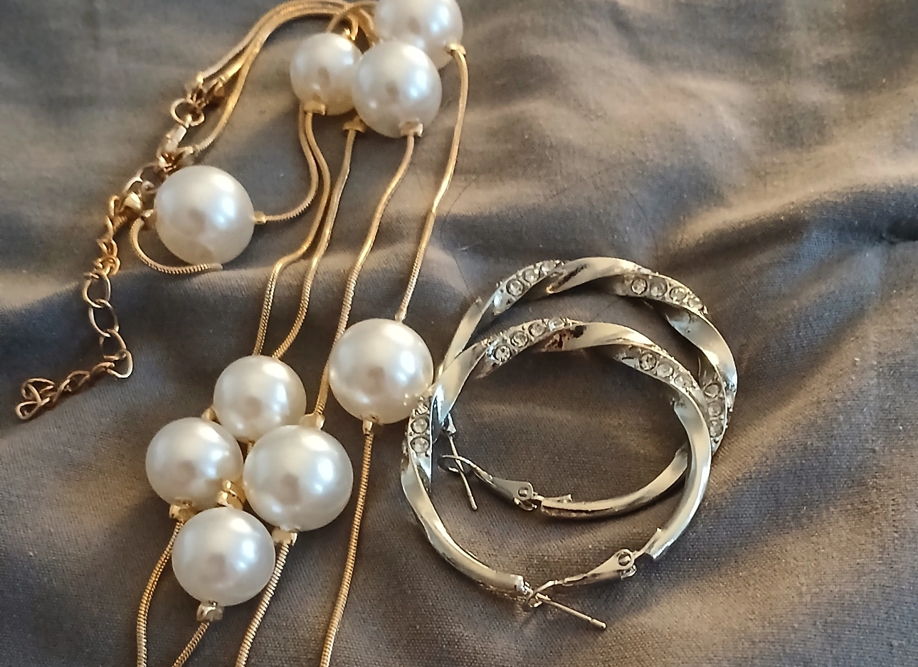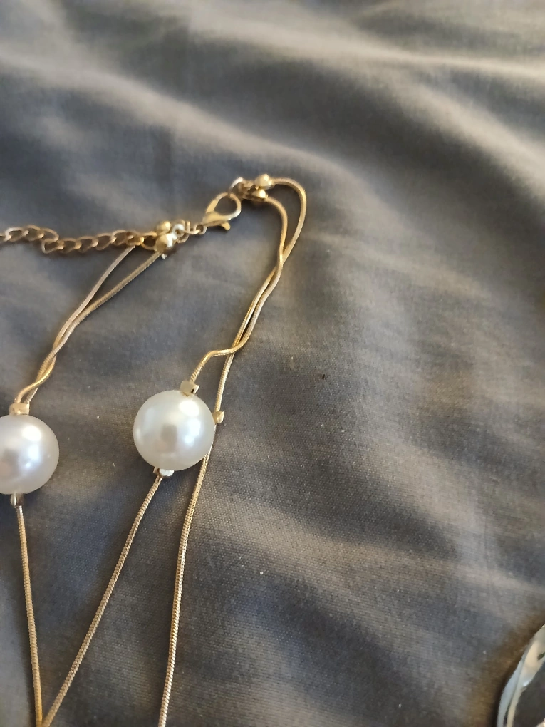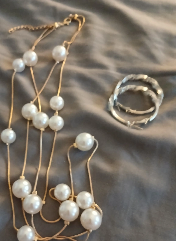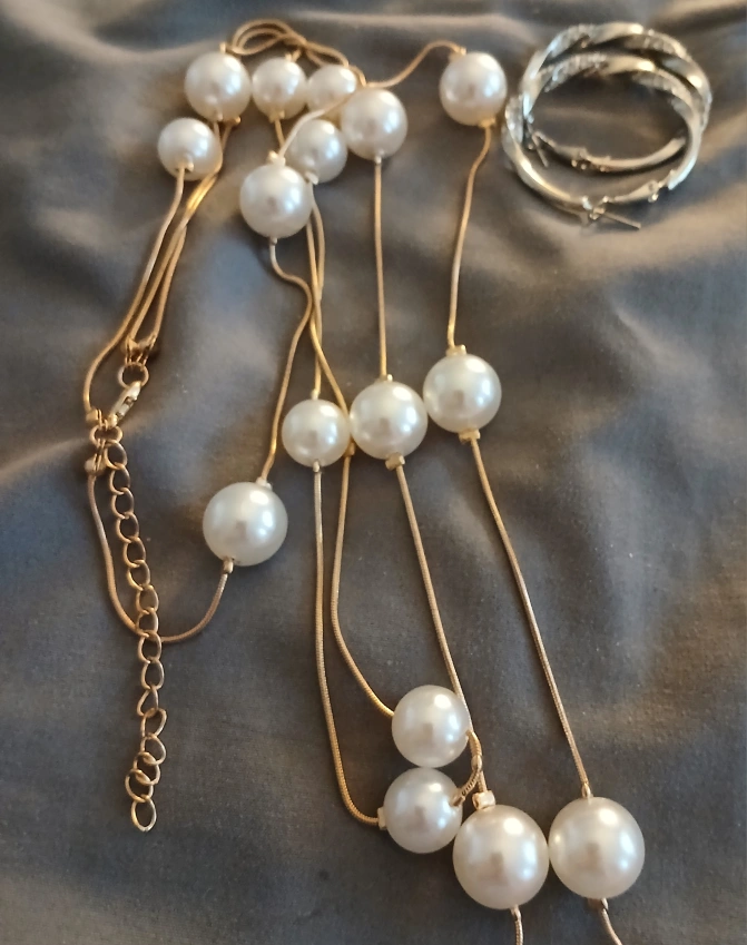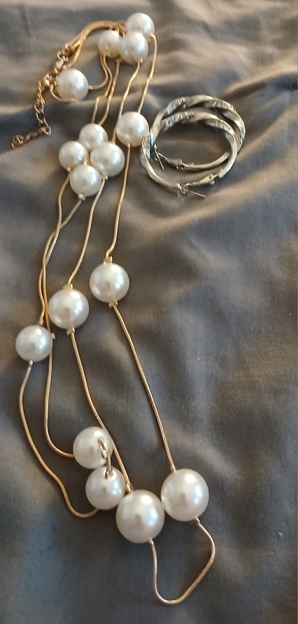 Here's a lovely set featuring a pearl necklace with gold-tone chains and a pair of hoop earrings. The necklace has multiple strands adorned with faux pearls, and the earrings are a classic hoop style with some detailing. A great addition to any jewelry collection! the necklace measures 22 inches looks great when u double it or wear as long set