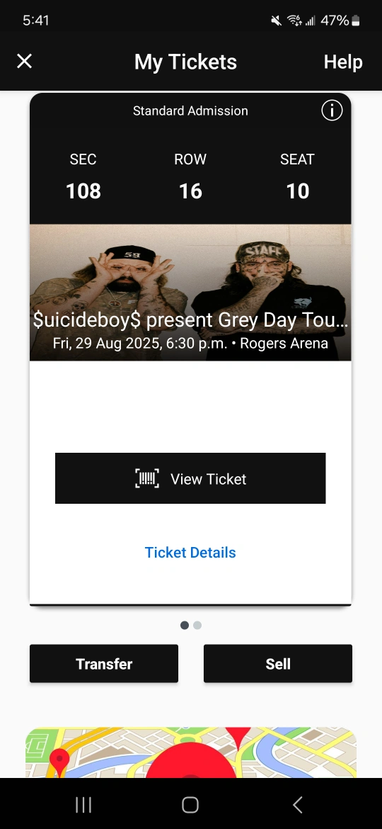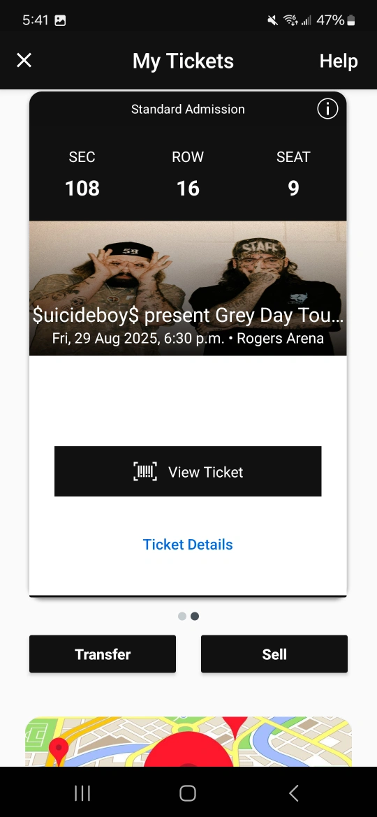 Selling one ticket to see Suicideboys present Grey Day Tour at Rogers Arena on Friday, August 29, 2025 at 6:30 p.m. Standard Admission, Section 108, Row 16, Seat 9 and 10 will transfer them thru ticket master