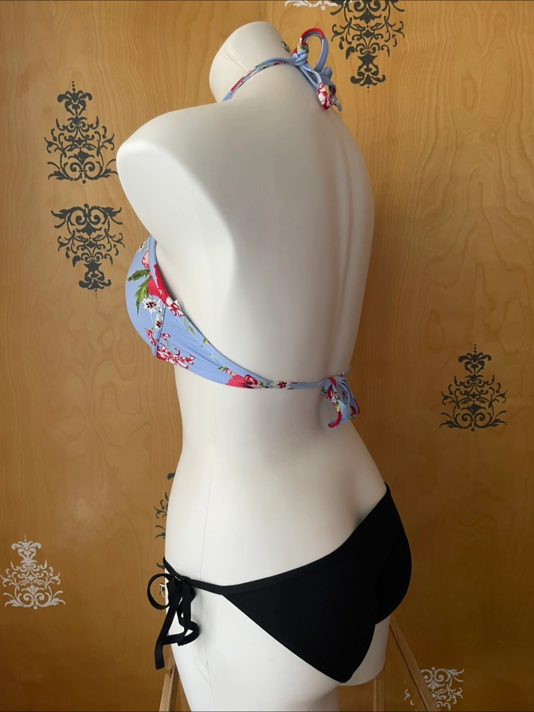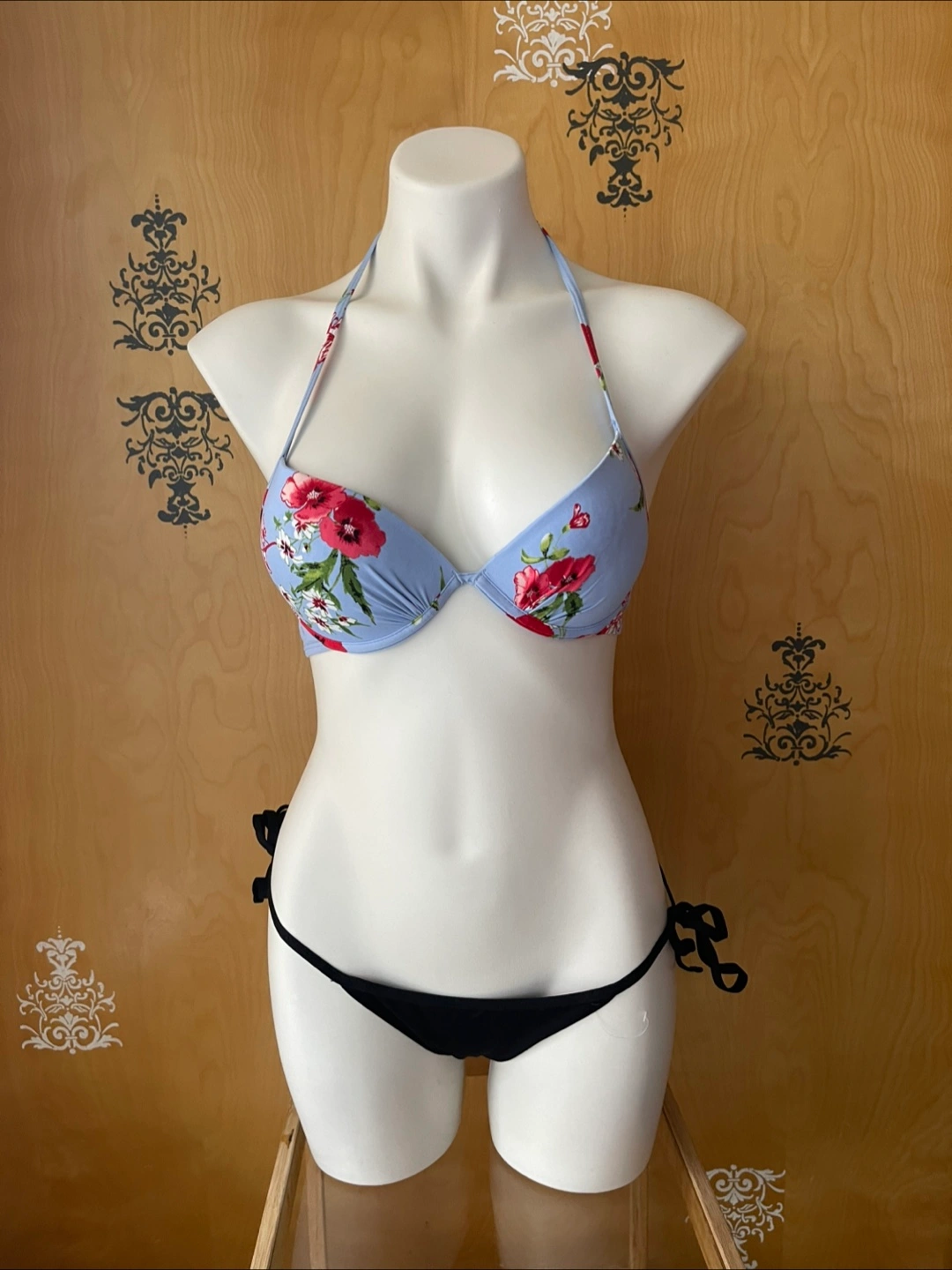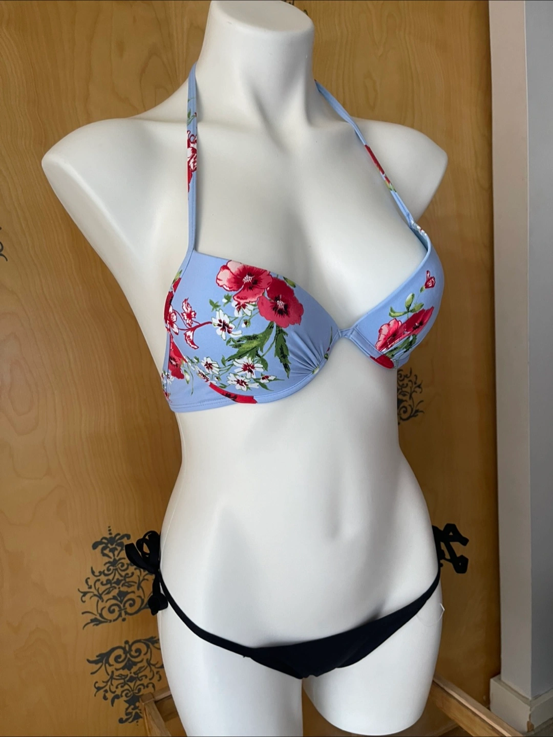Vintage 2000s Y2K Bikini Set Blue Floral Halter Top Underwire Low Rise Black Bottoms Tie Sides Small Condition: 10/10! Never worn -New Without Tag! Protective sticker on garment still on! Measurements Inches: Mannequin is an overall size Medium Top Tag Size: Small (but fits a Medium as well) US: 6-10 Bust: 32-36 Cup Size: A-C Bottoms: Small Waist: 27-29 Hips: 37-39 Top Style Details: Halter Top - adjustable & lengthly tie strings around neck & back Comfortable underwire for support - versatile movement such as water sports Colour: beautiful lavender blue with pink/green floral print Built in bra - boost/push up Bottom Style Details: Colour: black Low rise Cheeky coverage Adjustable side tie strings