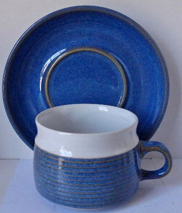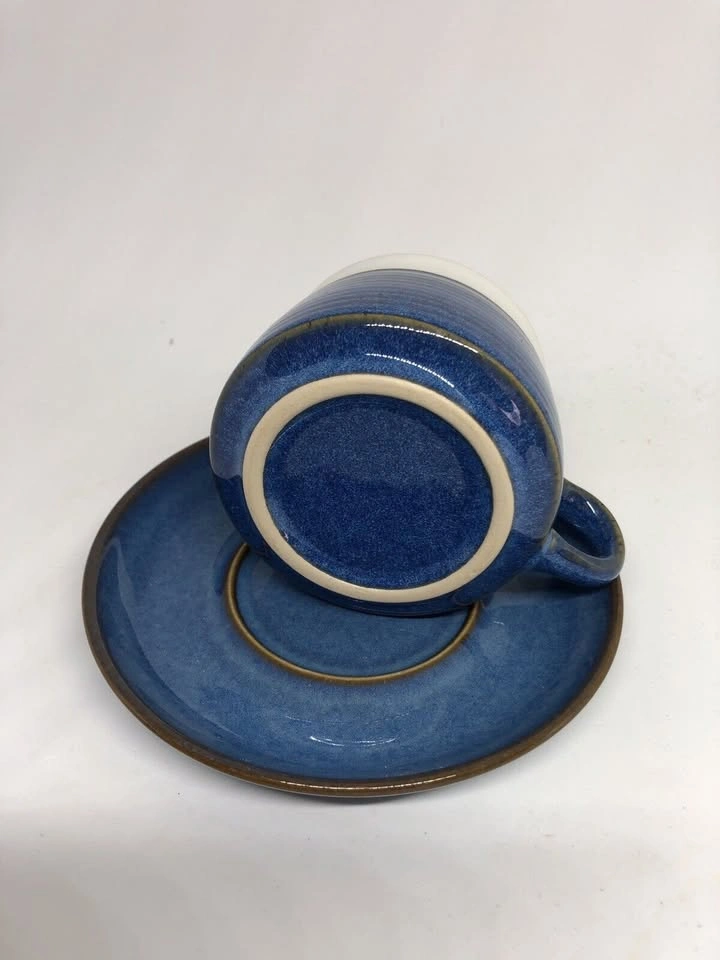 This beautiful two-piece cup and saucer set from Denbys Chatsworth line is a true vintage gem. Made of high-quality stoneware, it showcases a glossy blue finish and a charming mid-century modern style. The round shape, coupled with the blue and white pottery production style, makes it a perfect addition to any decorative cookware or dinnerware collection. Crafted in England in the 1970s, this cup and saucer set boasts a unique pattern that adds a touch of elegance to any tabletop. The set includes a cup and saucer, both featuring the Chatsworth design. 1 Cup and saucer In excellent used condition 12 available No chips or cracks Please feel welcome to ask any questions at any time either before or after the sale