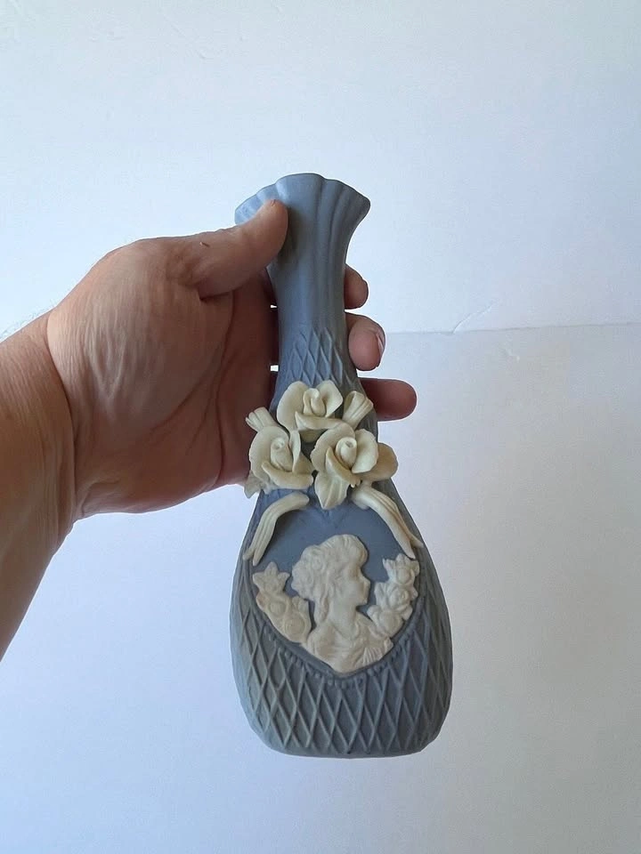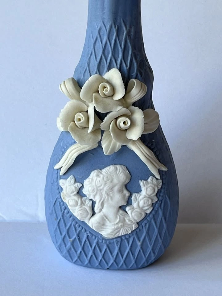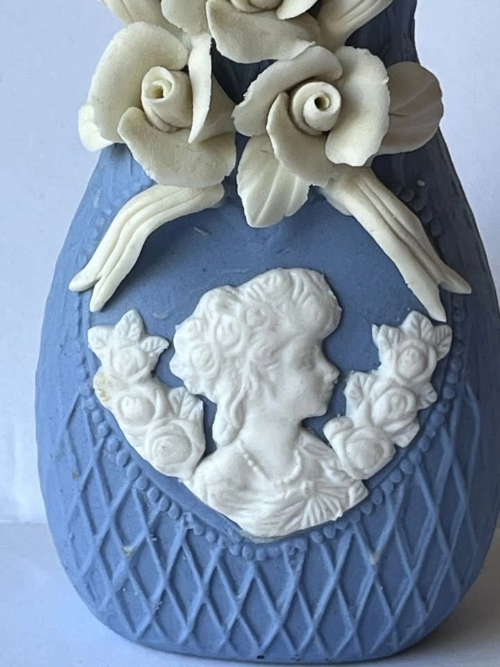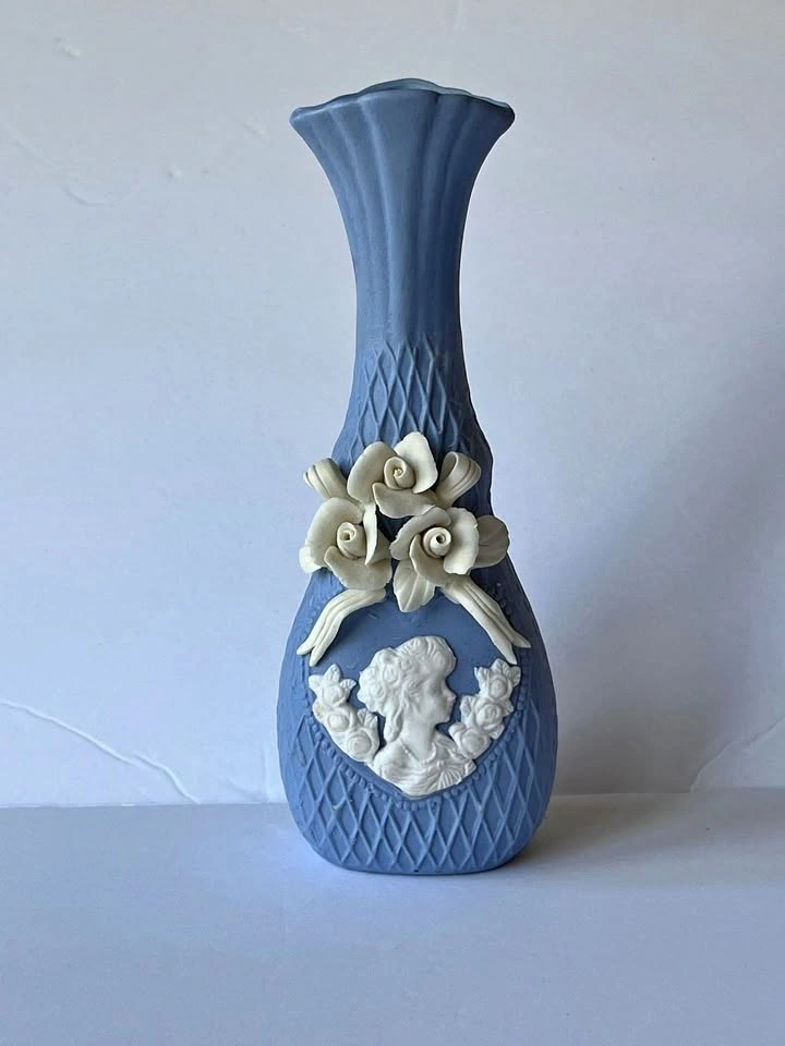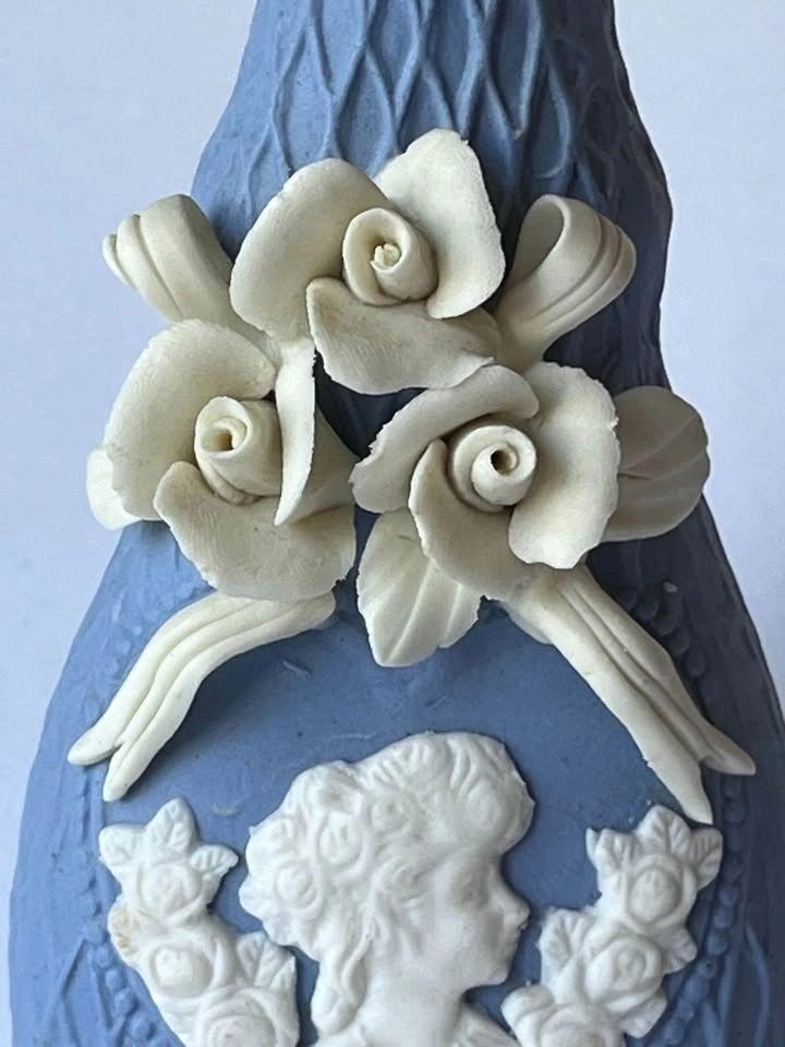 Absolutely stunning vase from the Wedgewood Company. In the classic blue and white, it features a stunning basket weave pattern over the lower half of the vase. Adorned with beautiful cream coloured roses and a beautiful crisp white cameo on the front. It is a beautiful cello shape, and the piece is roughly 8 inches high by 2 1/2 inches wide and is in pristine condition. It is absolutely spectacular in person!