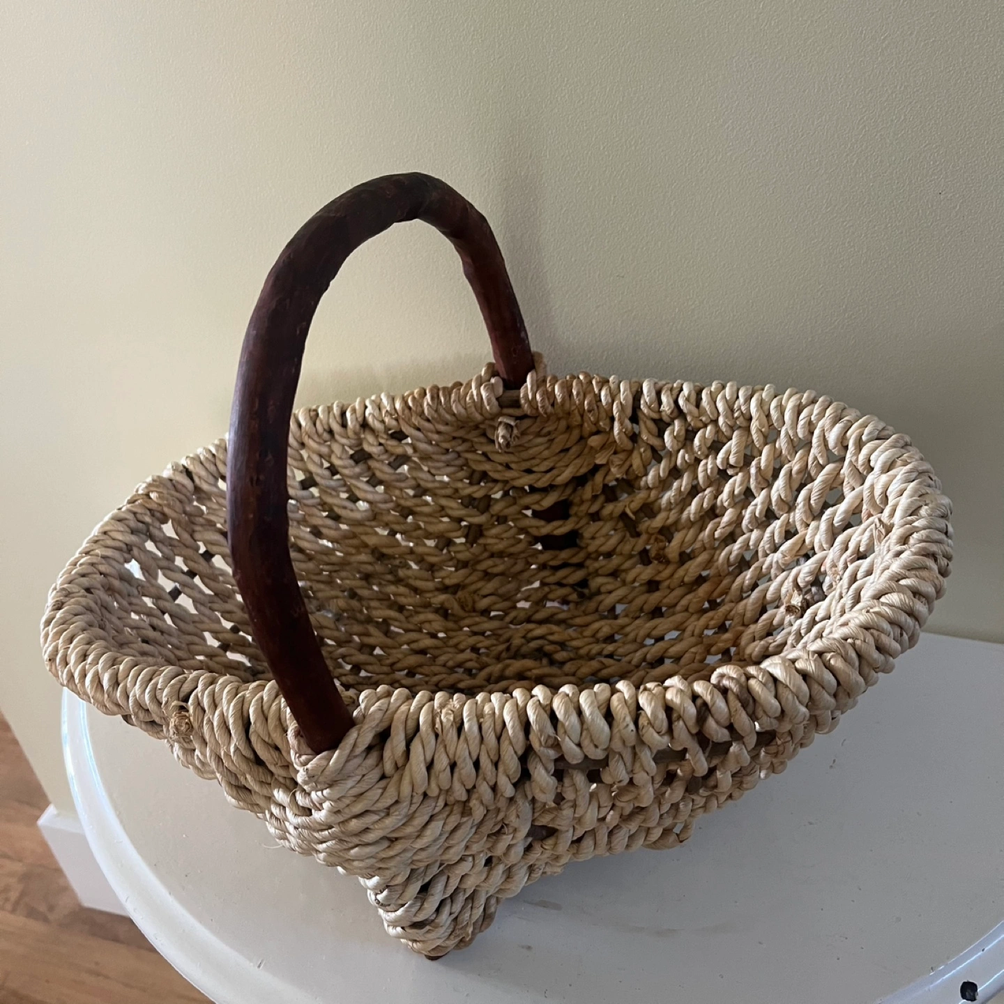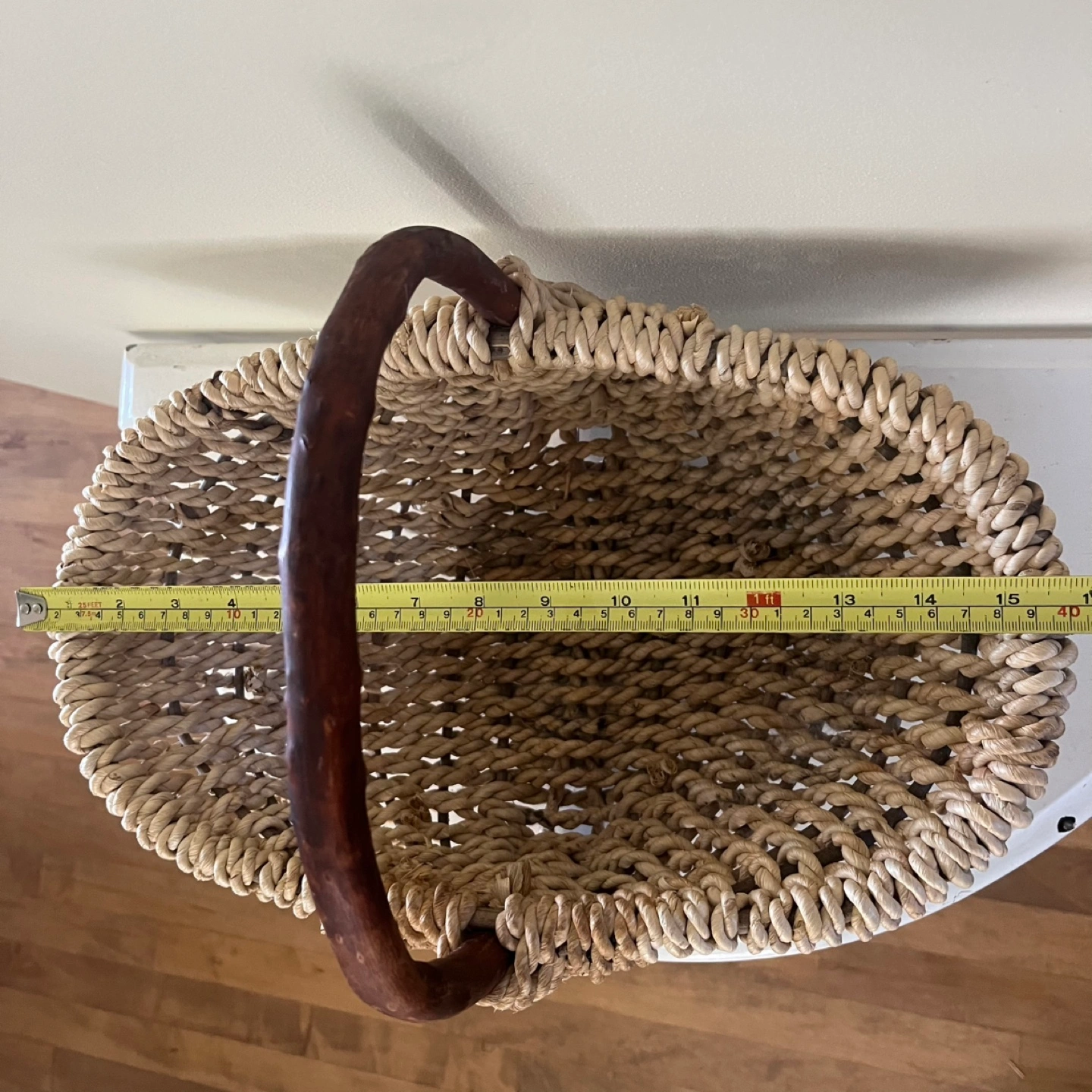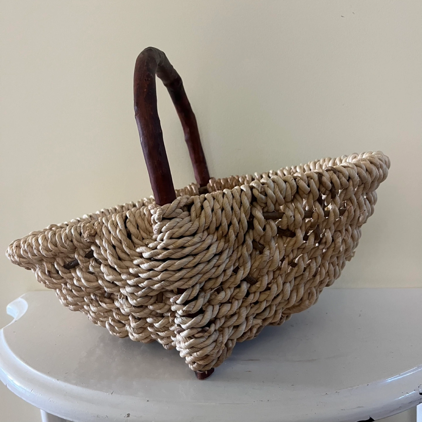 Charming woven basket with a sturdy wooden handle and a unique, rustic design. This basket shows some signs of wear, which only adds to its vintage appeal. Pick up Montgomery. Cross-posted. Please see my other listings for more vintage treasures.