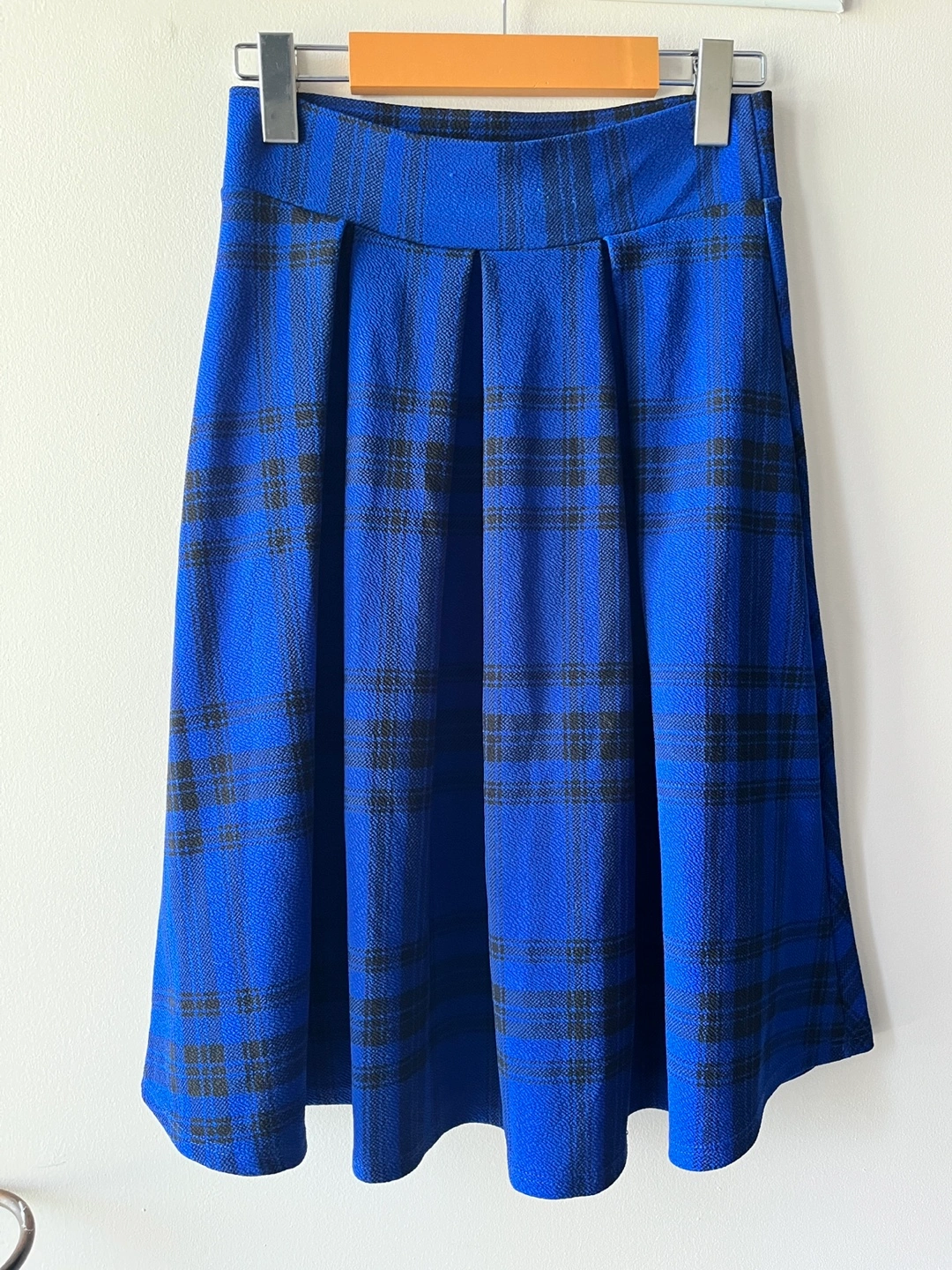 Here's a cute blue plaid skirt! The material has a nice texture, and the fabric is stretchy. Worn a few times. Excellent condition.